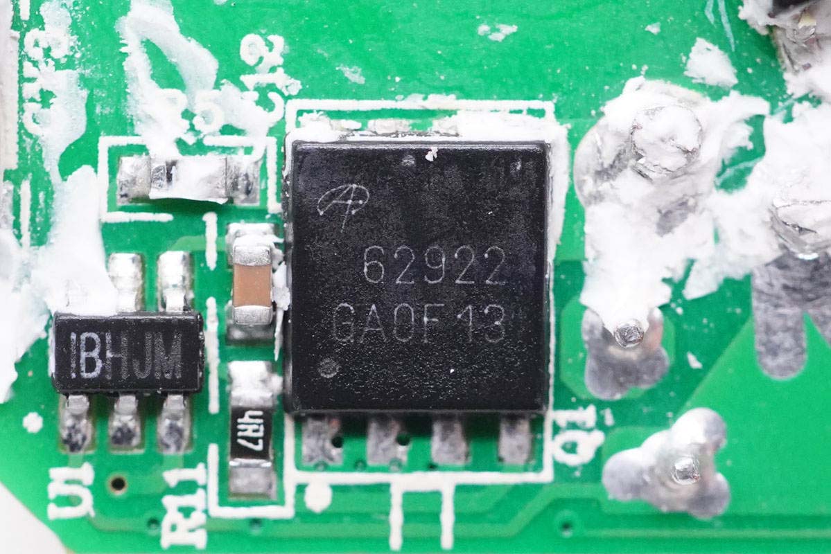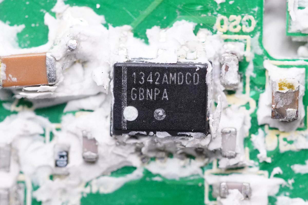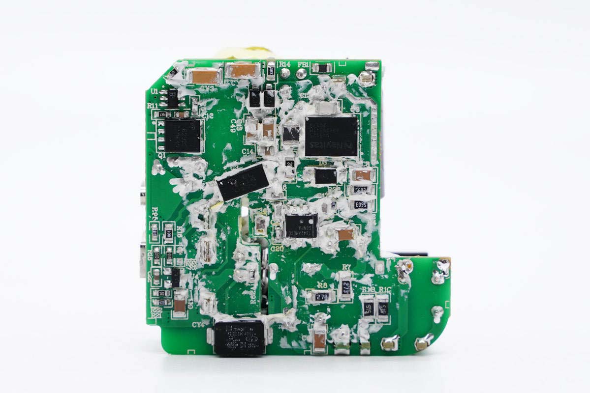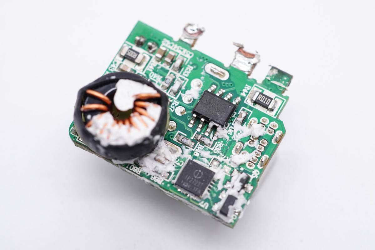 将硅胶清理干净可以看到,光耦和贴片Y电容横跨初次级,初级侧设有主控芯片和氮化镓功率芯片,次级侧设有同步整流控制器和同步整流管。