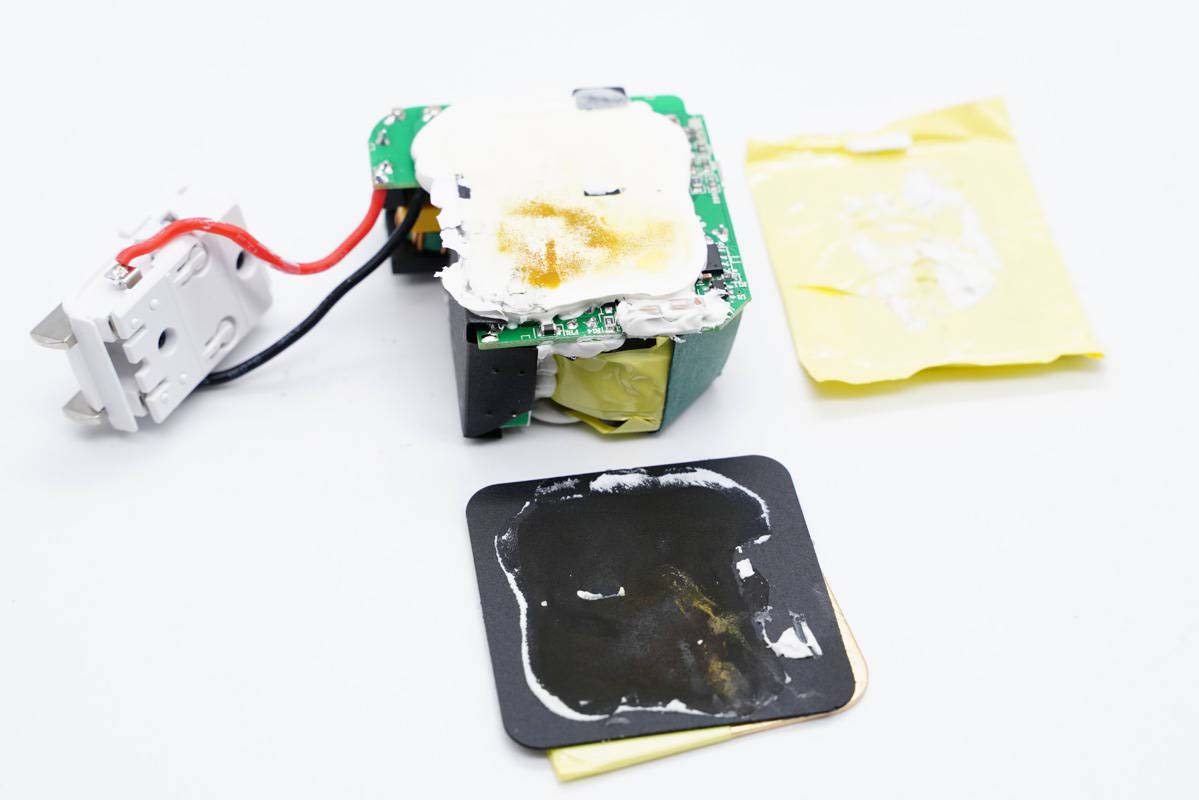 将机身壳从侧面拆开,充电器主板背面覆盖绝缘隔离板和黄铜散热片。