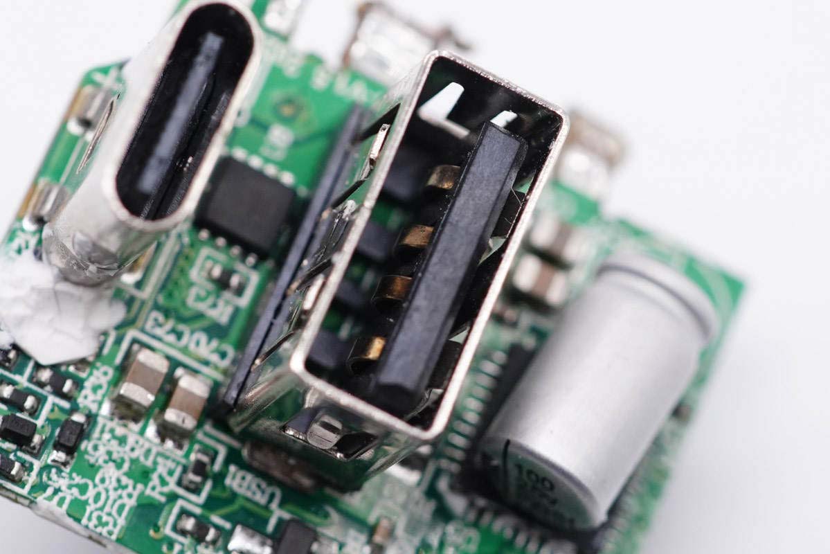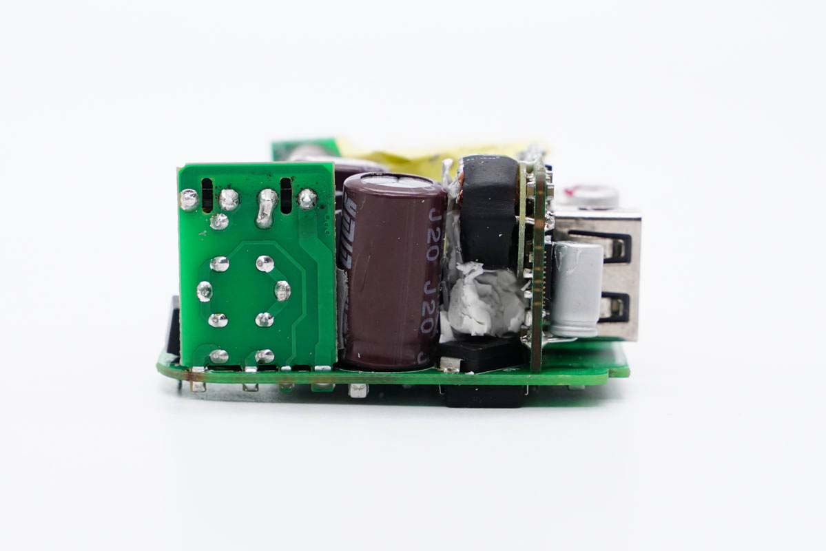 充电器输出端设有小板,USB母座垂直焊接在小板上,两颗滤波固态电容打胶加固。