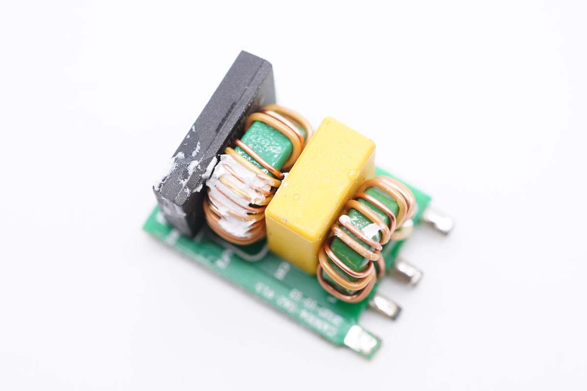 输入端小板上设有两级共模电感、X电容以及整流桥。