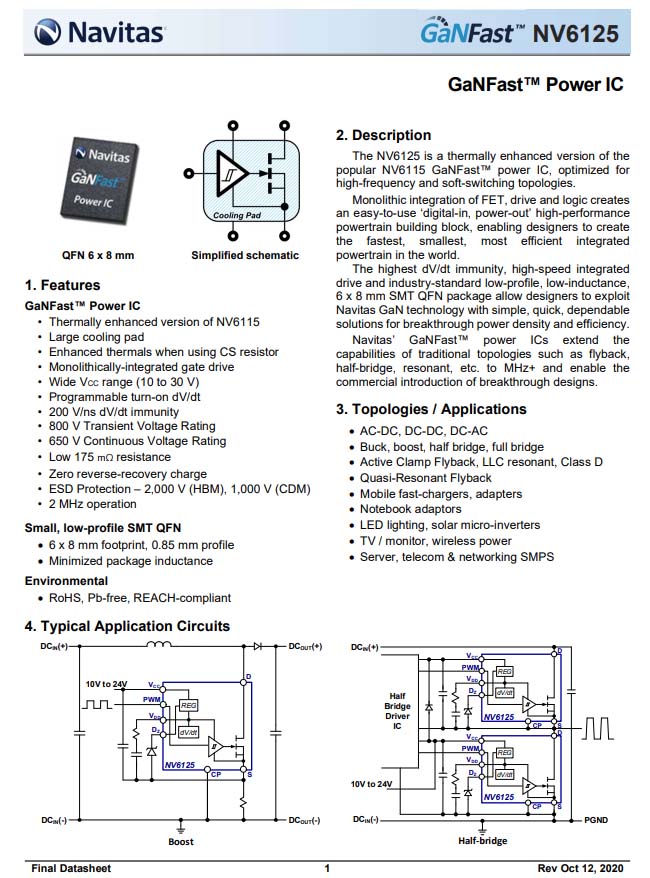 氮化镓功率芯片采用纳微NV6125,内置驱动器,无需外置驱动器,175mΩ导阻,耐压650V,支持2MHz开关频率,采用散热增强的QFN6*8mm封装,适用于升压,降压,半桥,全桥开关电源等诸多应用场合。
