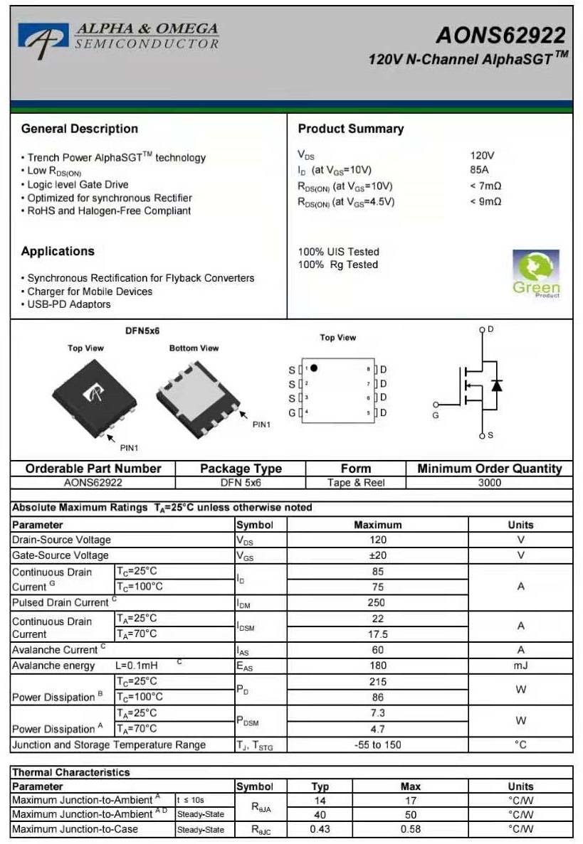 次级同步整流MOS管采用AOS万代的AONS62922,NMOS,耐压120V。