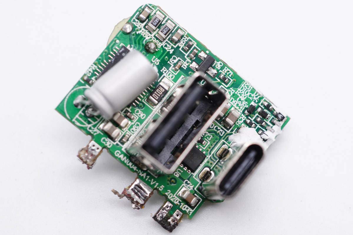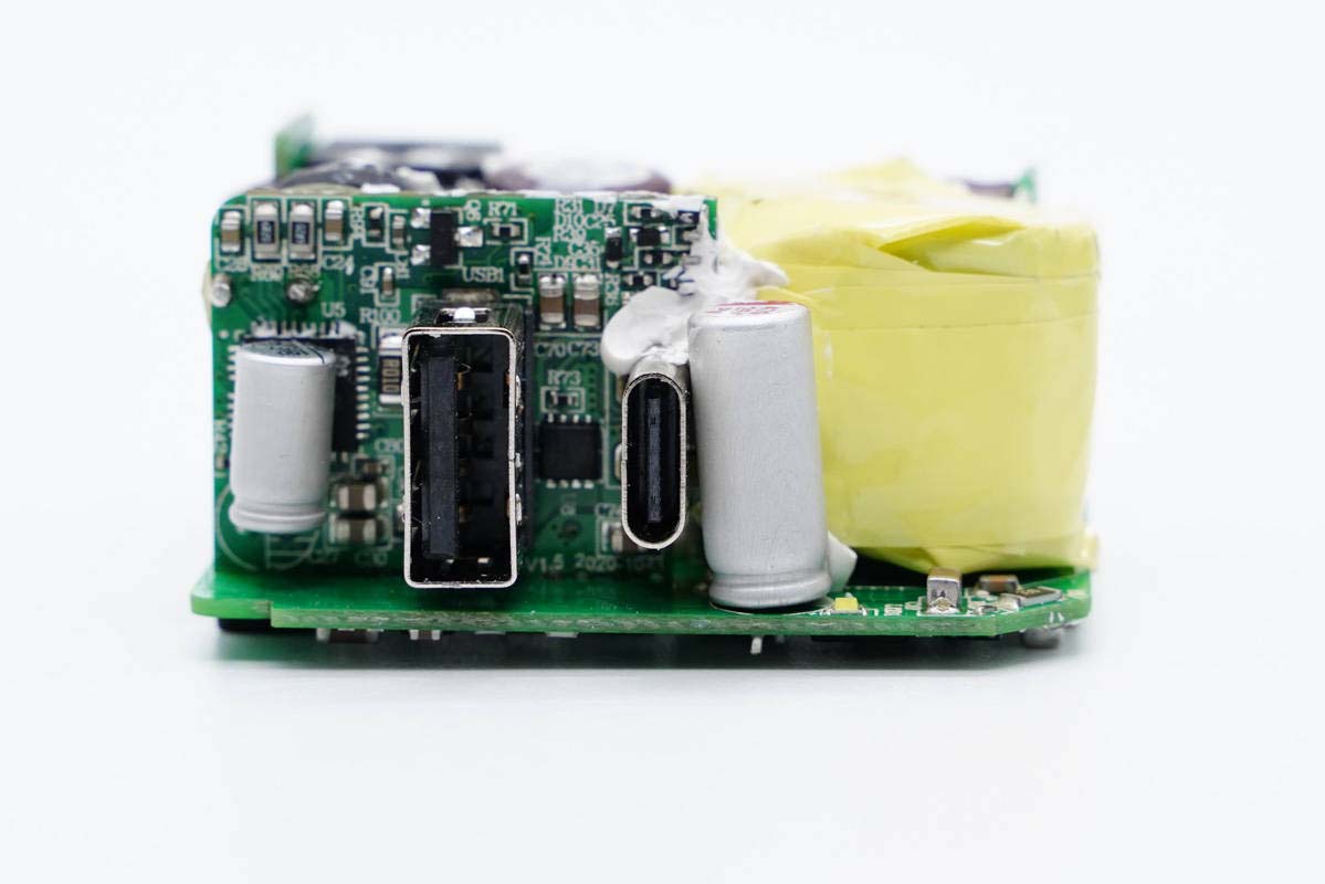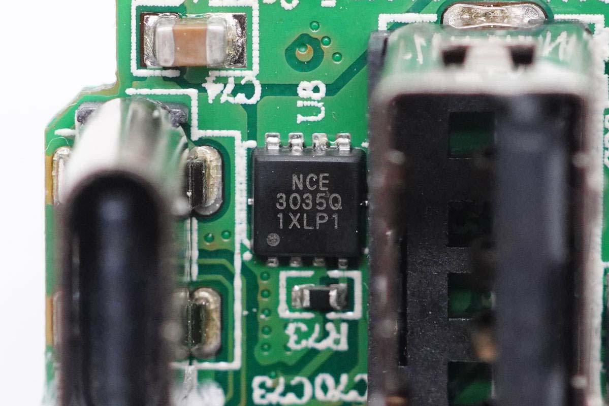 其中开关电源由安森美NCP1342搭配纳微氮化镓功率芯片,以及MPS MP6908A搭配万代同步整流管组成。由英集芯IP2723T和IP2163分别控制C口和A口输出电压,但同步整流后,USB-A口还采用南芯SC8903进行升降压电压转换。