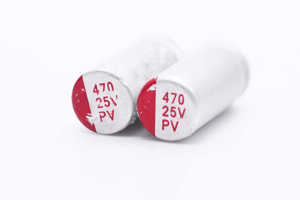 两颗输出滤波固态电容采用韶关富仕达PV系列,规格都是25V 470μF,具有125℃耐热,高可靠性的特点。