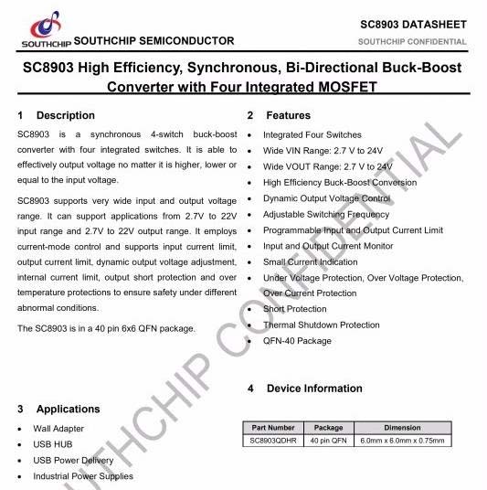 南芯SC8903规格资料。充电头网了解到,南芯SC8903此前已被Anker PowerCore Fusion PD超级充MOMAX 66W USB PD充电器等产品采用。