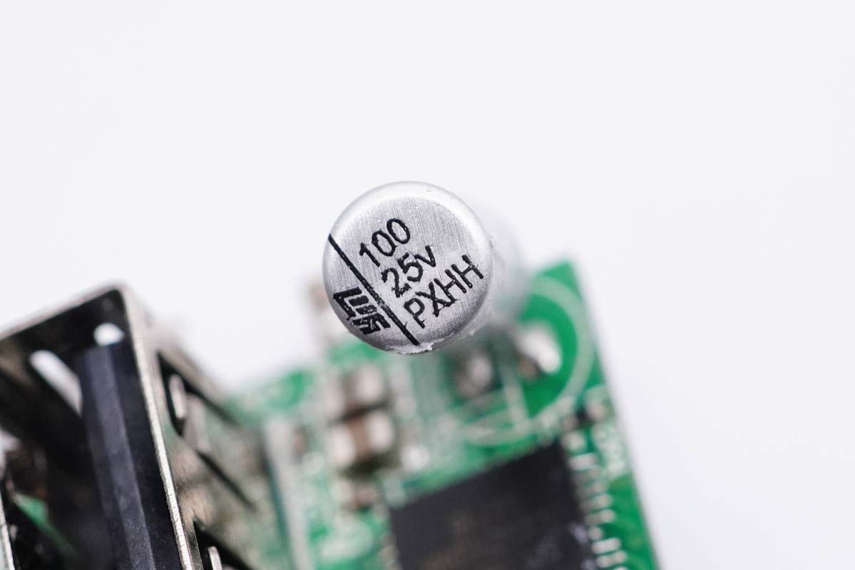 USB-A口输出滤波固态电容,永铭NPX系列,规格为25V 100μF。该系列电容具有小体积、低ESR、高容许纹波电流、高可靠性等特点。