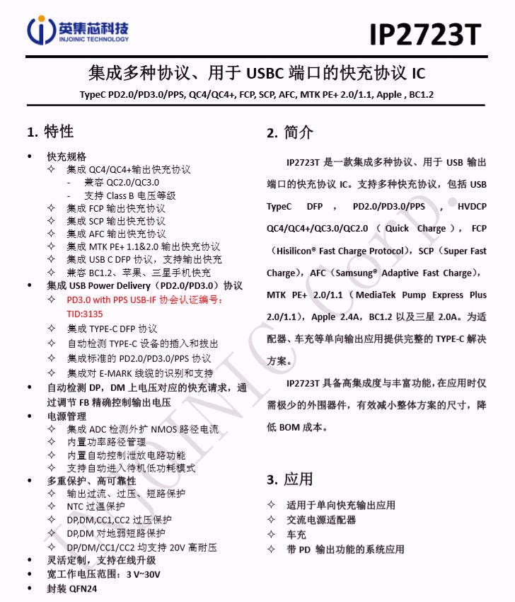 USB-C口协议芯片采用英集芯IP2723T。该芯片已通过USB IF协会PD3.0 PPS认证,TID:3135,是一款集成多种协议、用于USB输出端口的快充协议IC。支持多种快充协议,包括USB TypeC DFP、PD2.0/3.0、PPS 、HVDCP QC4、QC4+、QC3.0/2.0、FCP、SCP、AFC、MTK PE+ 2.0/1.1、Apple 2.4A、BC1.2以及三星2.0A。为适配器、车充等单向输出应用提供完整的TYPE-C解决方案。此外IP2723T具备高集成度与丰富功能,在应用时仅需极少的外围器件,有效减小整体方案的尺寸,降低BOM成本。