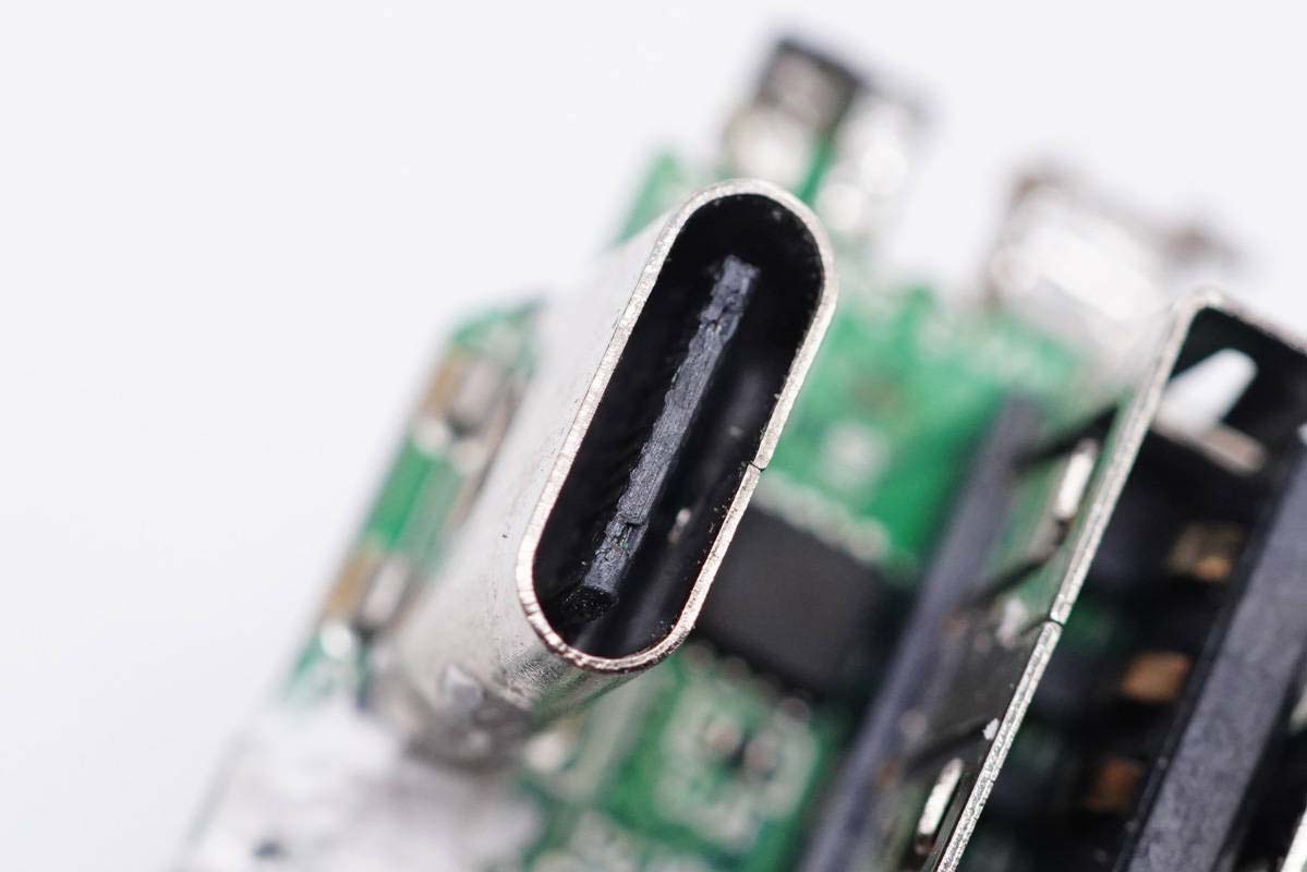 输出端小板正面一览,除USB母座外,还设有升降压芯片、输出滤波固态电容和输出VBUS开关管。