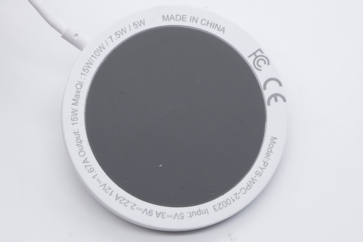无线充电板正面特写,无线充电板采用黑白两种配色。中间黑色区域为橡胶油材质,同时也是无线充电发射端。外圈的白色区域为磁吸所在,上面标准了产品的一些参数信息。