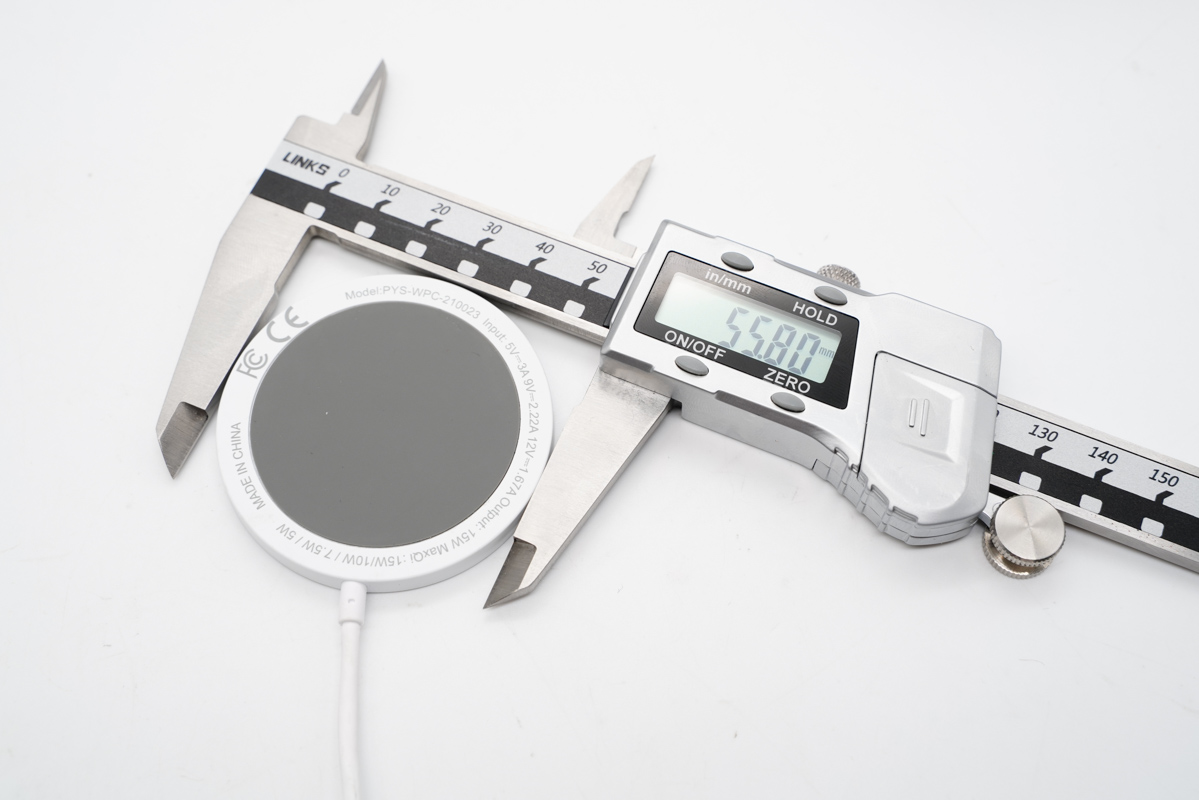 作为对比,苹果原装MagSafe磁吸无线充电板的直径约为55.81mm。可以看出二者大小几乎一致。