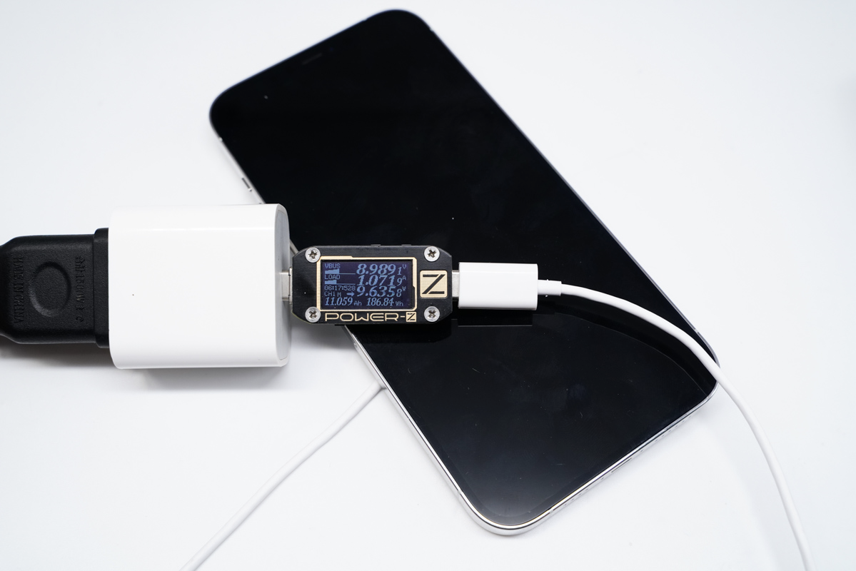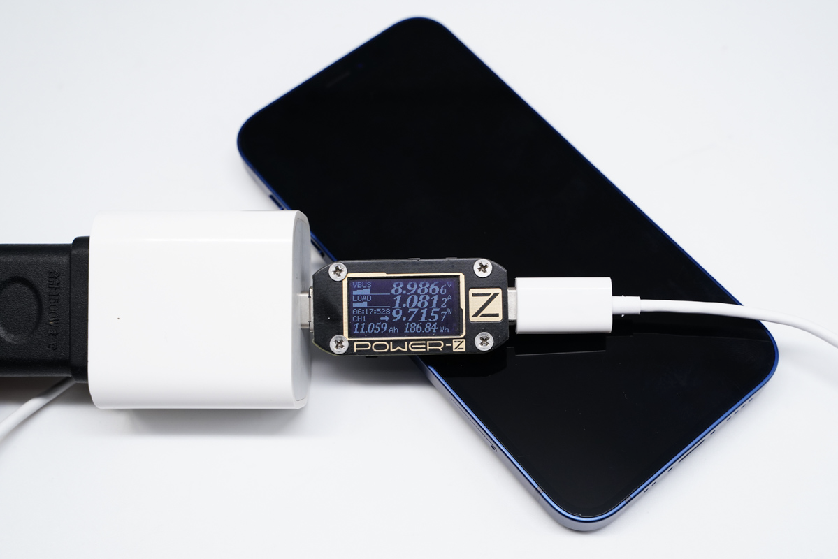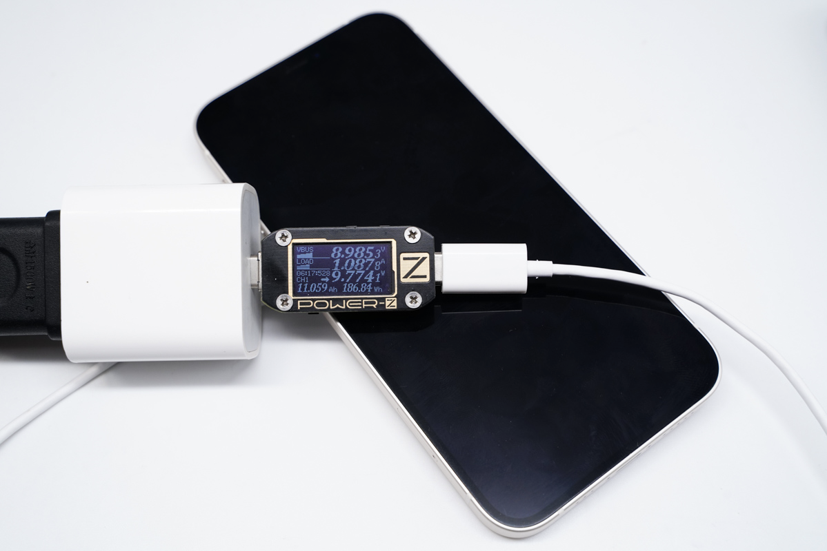 同样状态下将iPhone 12 mini换成iPhone 12,POWER-Z KM001C读取到充电器输出端的功率为8.98V 1.08A 9.77W。