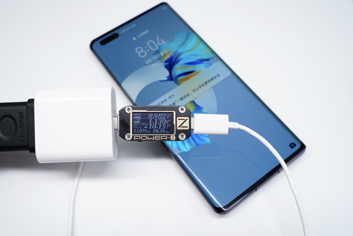 PYS鹏元晟MagSafe磁吸无线充电器使用的是通用的Qi无线充电协议,所以也可以为其他安卓手机充电,实际使用PYS鹏元晟MagSafe磁吸无线充电器搭配苹果20W PD充电器为华为Mate40 Pro充电,充电器输出端功率为8.98V 1.13A 10.15W。