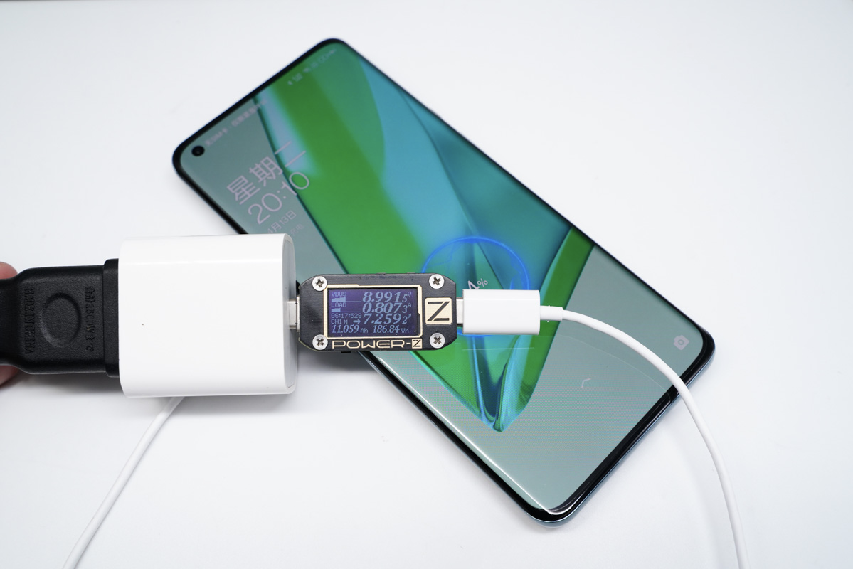 同样状态下为一加9 Pro充电,充电器输出端功率为8.99V 0.80A 7.25W。