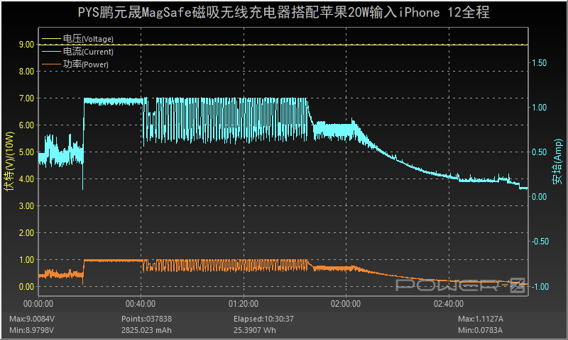 使用PYS鹏元晟MagSafe磁吸无线充电器搭配苹果20W PD充电器为iPhone 12 mini充电,充电器输出端的功率为8.98V 1.08A 9.71W。