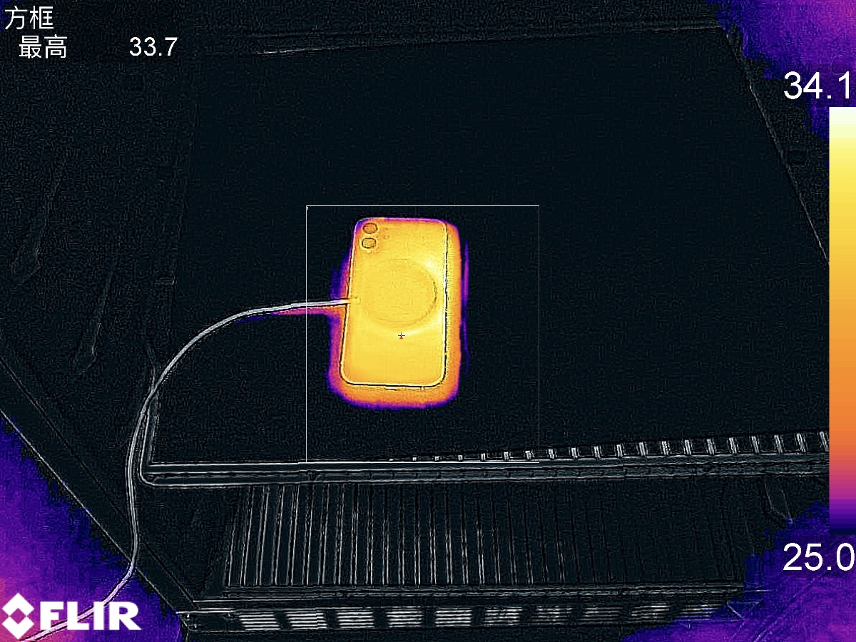 2小时后采集到手机面板最高温度为33.7℃,最高温度位于无线充电板靠近手机接口的位置。