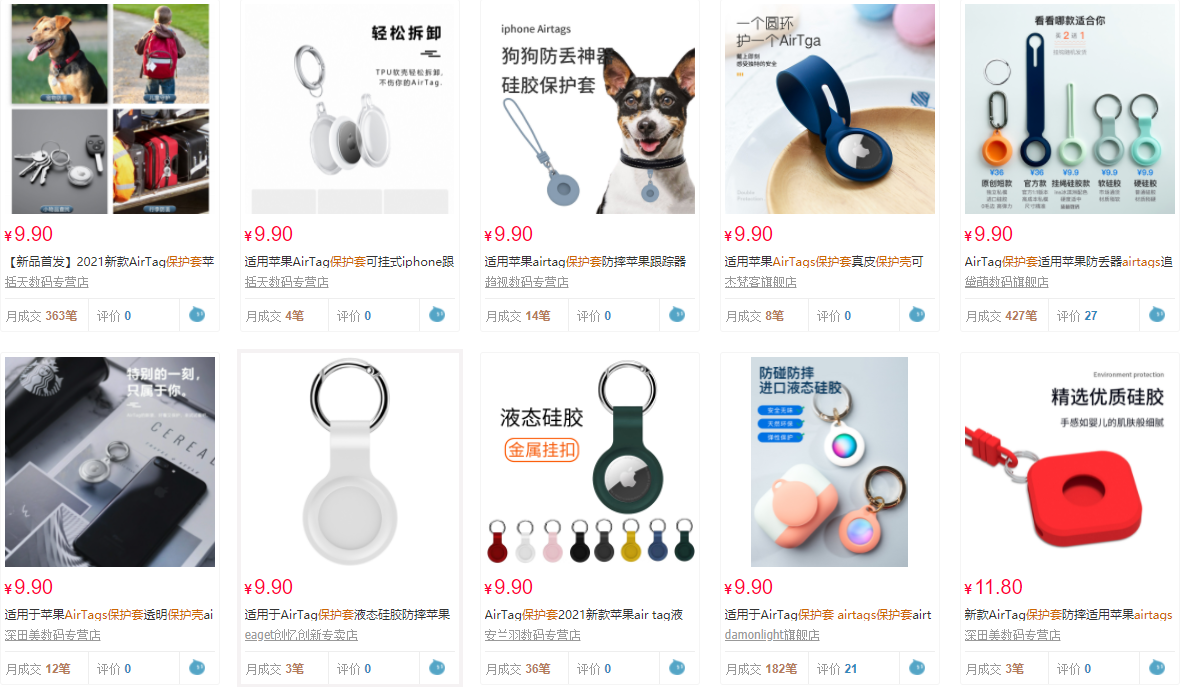 去某宝搜一圈,9块9包治百病。反正最后都是用来防丢的嘛,风吹日晒的,保护套又没什么科技含量,能用就行。就像AirPods最后还是会变成“Air”一样,说不定AirTag最后也是“Air”呢,这不正好光荣完成使命了?