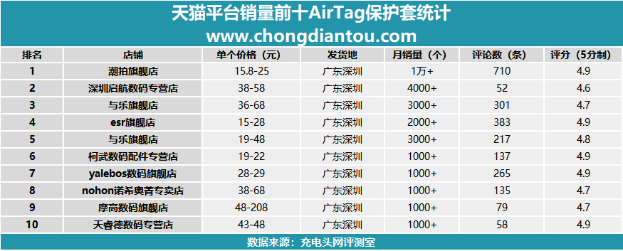 无数据不说话,我们统计了天猫平台排名前十的AirTag保护套产品,时间是4月30日18:00左右,以此作为样本进行分析。