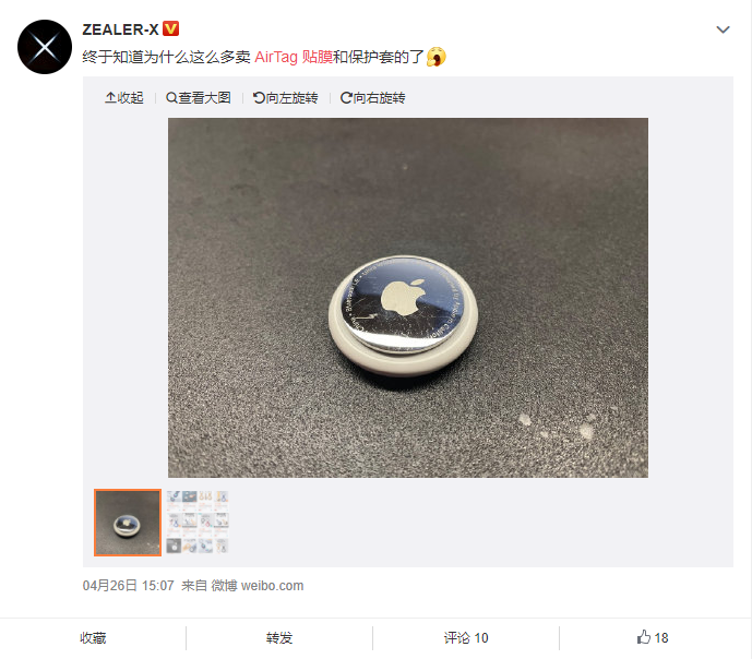 博主@ZEALER-X就发了一套微博,配图是刮花了的AirTag,配文:终于知道为什么这么多卖 AirTag 贴膜和保护套的了。