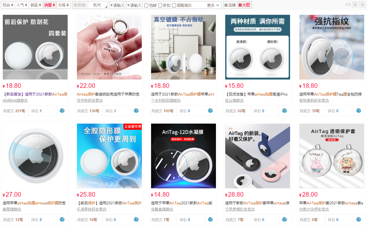 电商平台上AirTag贴膜显然不如保护套火热啦,可以看到两者整体销量就不是一个数量级的。但是小编逐个查询之后,发货地同样是广东深圳,看来深圳的产业链优势确实很牢固。
