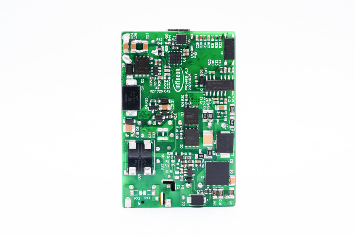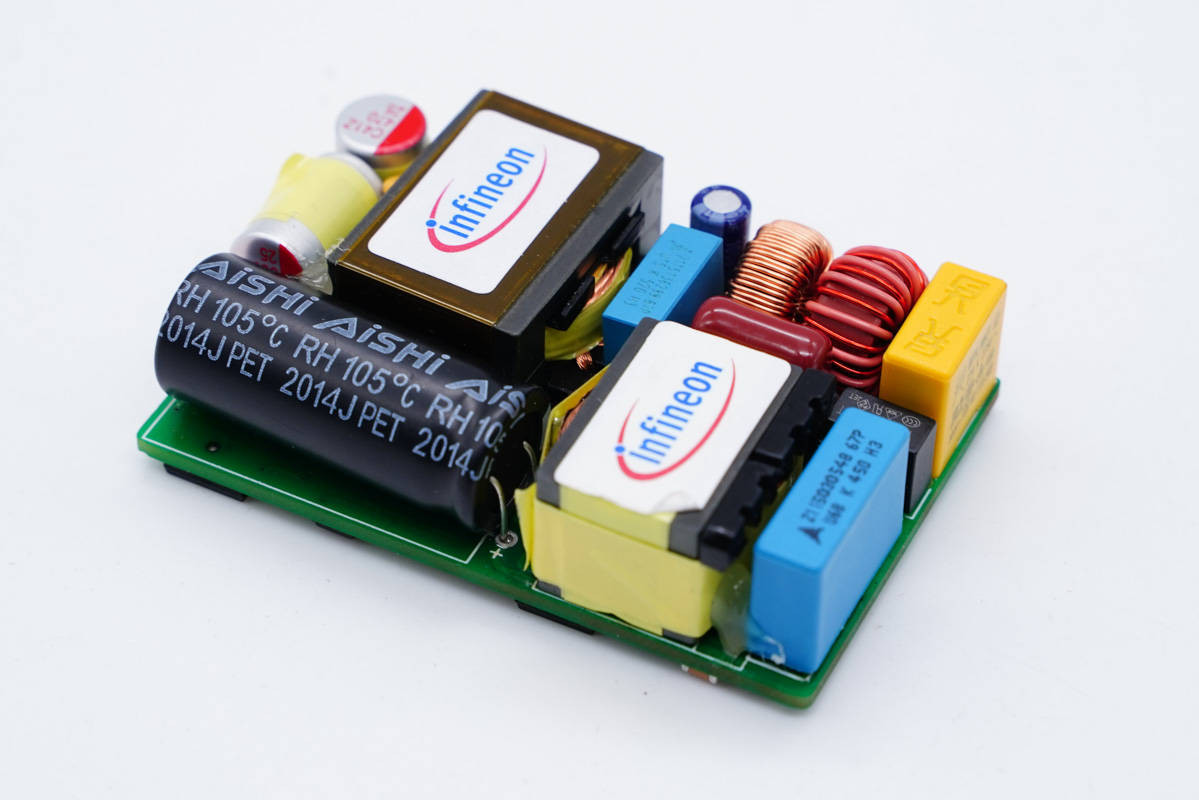 英飞凌这款参考设计具有PFC电路,两个贴着英飞凌标签的,右侧是PFC升压线圈,左侧是变压器。元件布置十分紧密。