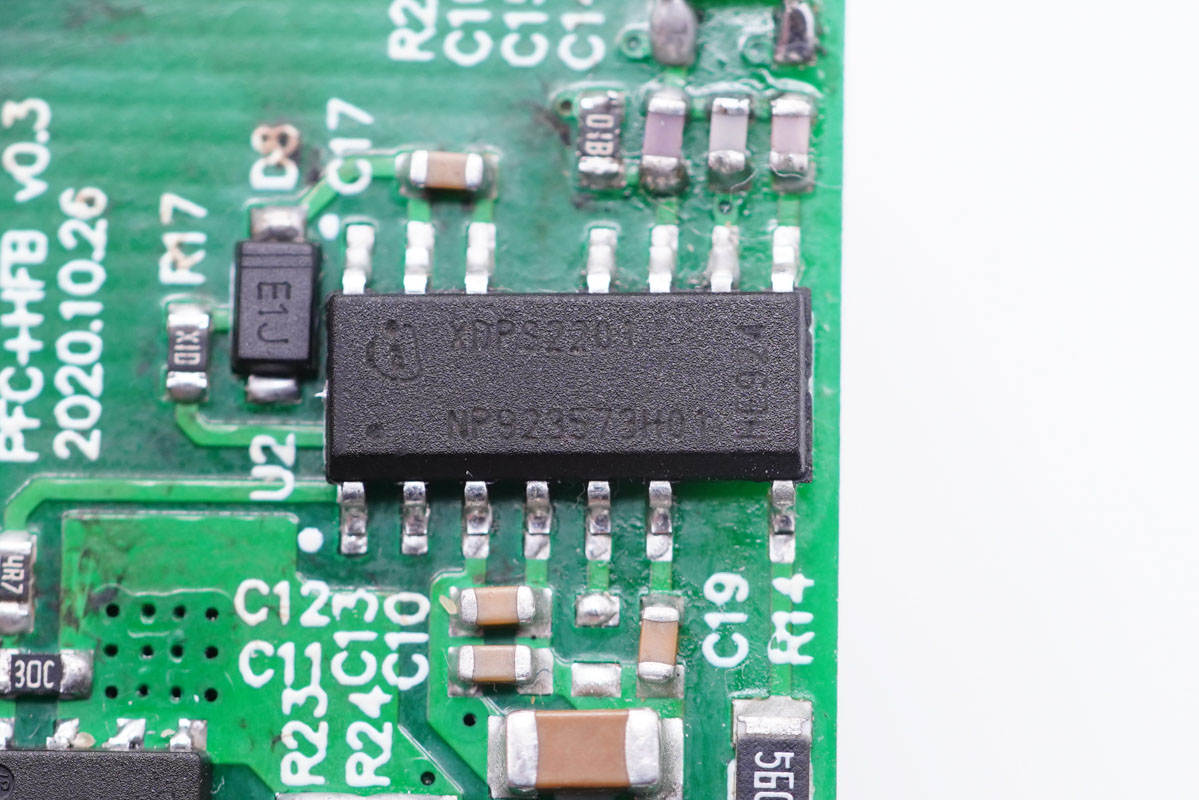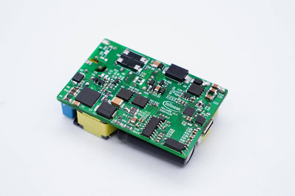 这个100W参考设计,采用了PFC电路和XDPS2201混合反激控制器以及CYPD3174协议芯片。