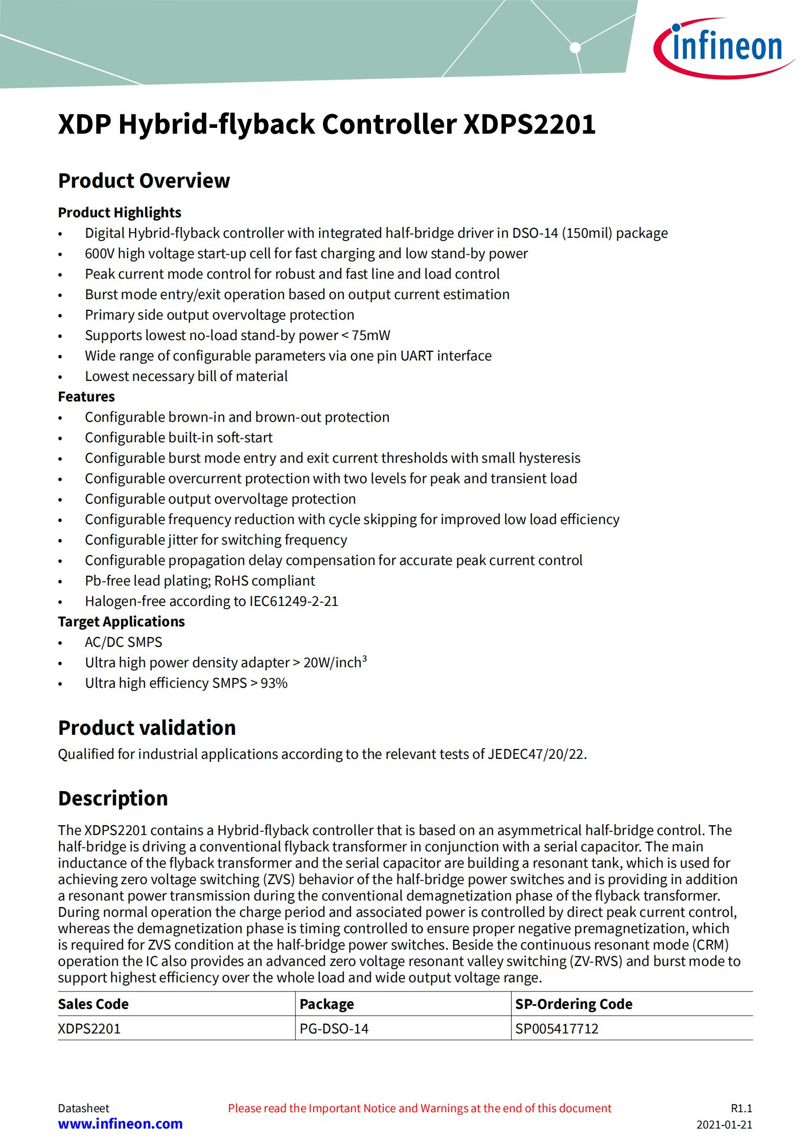 英飞凌XPDS2201可通过UART接口配置电源输入电压保护,配置内部软启动,配置突发模式的启动电流,配置用于峰值和瞬态的两级过电流保护,配置输出过电压保护,配置降频和跳周期用于提高轻载效率,配置抖频,配置用于精确峰值电流控制的传播延迟补偿。适用于AC/DC开关电源,可实现超高功率密度的适配器,功率密度大于20W/立方英寸,超高转换效率高于93%。