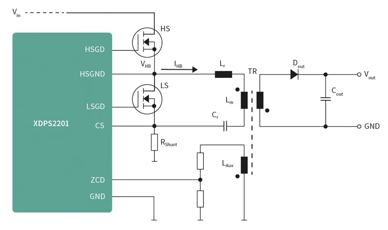 英飞凌XDPS2201集合反激和LLC的优点,推出了新的非对称半桥混合型反激拓扑,这个新式的反激拓扑,采用半桥和串联电容器共同驱动传统的反激变压器,反激变压器的主电感和串联电容器形成谐振回路,用于实现半桥开关的ZVS开关,并在退磁阶段提供谐振功率传输。正常运行模式下,充电周期和相关功率由峰值电流控制。退磁阶段通过定制控制,以确保合适的负预磁化,满足半桥所需的ZVS条件。