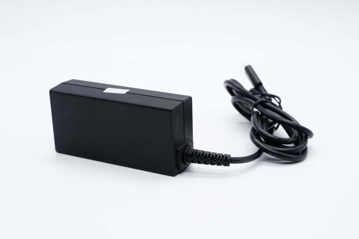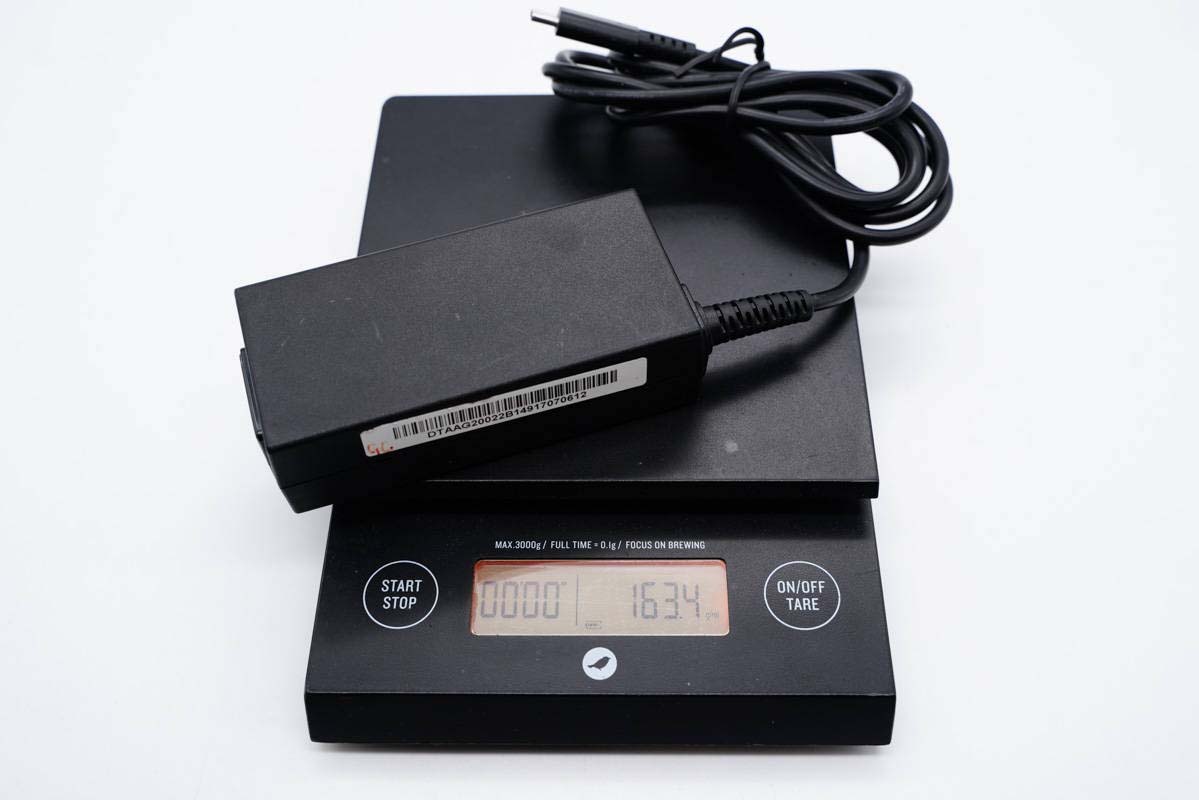 这款适配器采用笔电传统标配电源样式设计,自带USB-C输出线缆。机身采用板砖造型设计,PC材质黑色外壳表面磨砂处理。