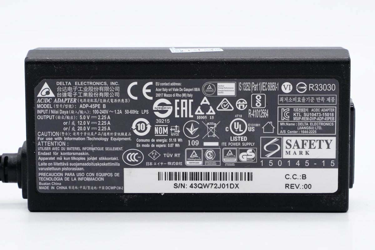 台达这款45W PD快充电源适配器采用传统笔电电源适配器样式设计,自带USB-C输出线缆,另外输入电源线可拆卸更换,加上产品通过了多项认证,因此只需更换对应规格的电源线即可在各个地区使用。适配器具备5V2.25A、12V2.25A、20V2.25A三组电压档位,支持PD快充的设备都可以使用。