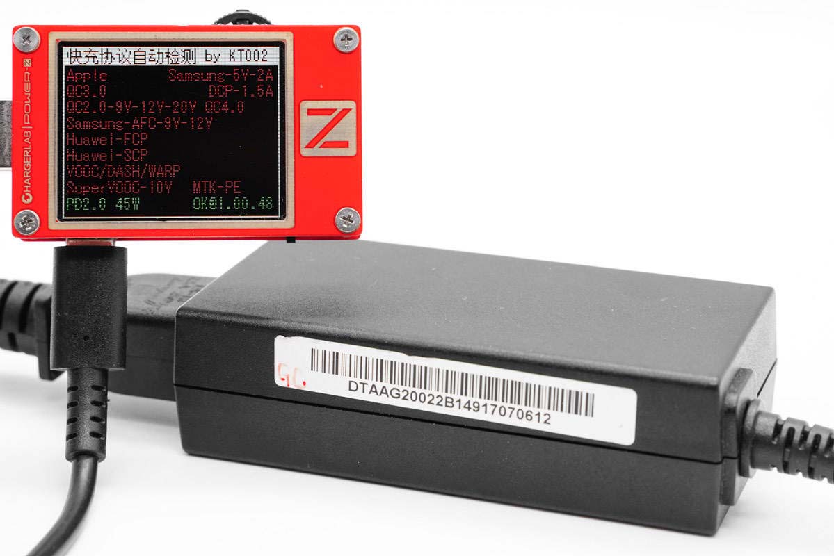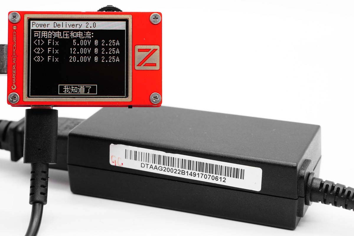 使用ChargerLAB POWER-Z KT002测得适配器仅支持PD2.0快充协议。