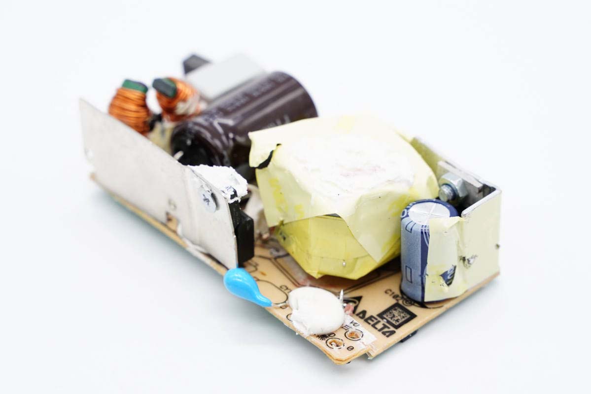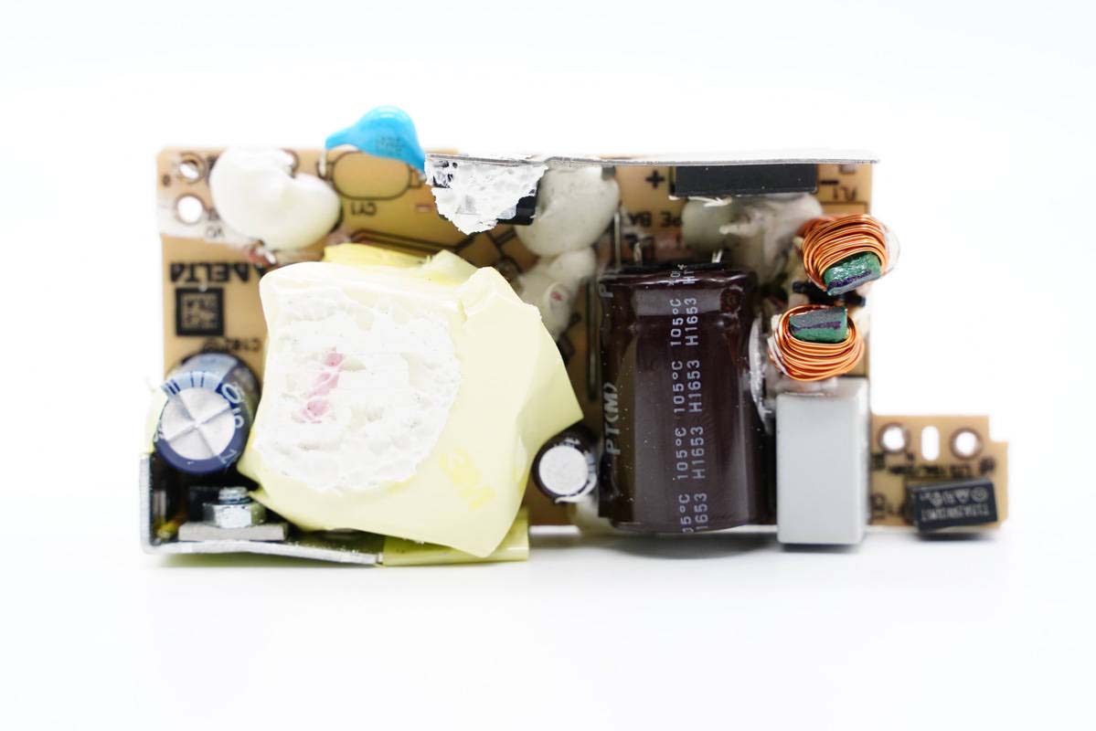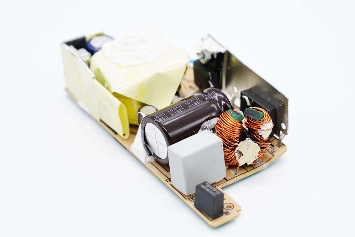 输入端一览,设有延时保险丝、安规X电容、共模电感、整流桥、高压滤波电解电容、主控芯片供电电容,共模电感也被拆碎了。