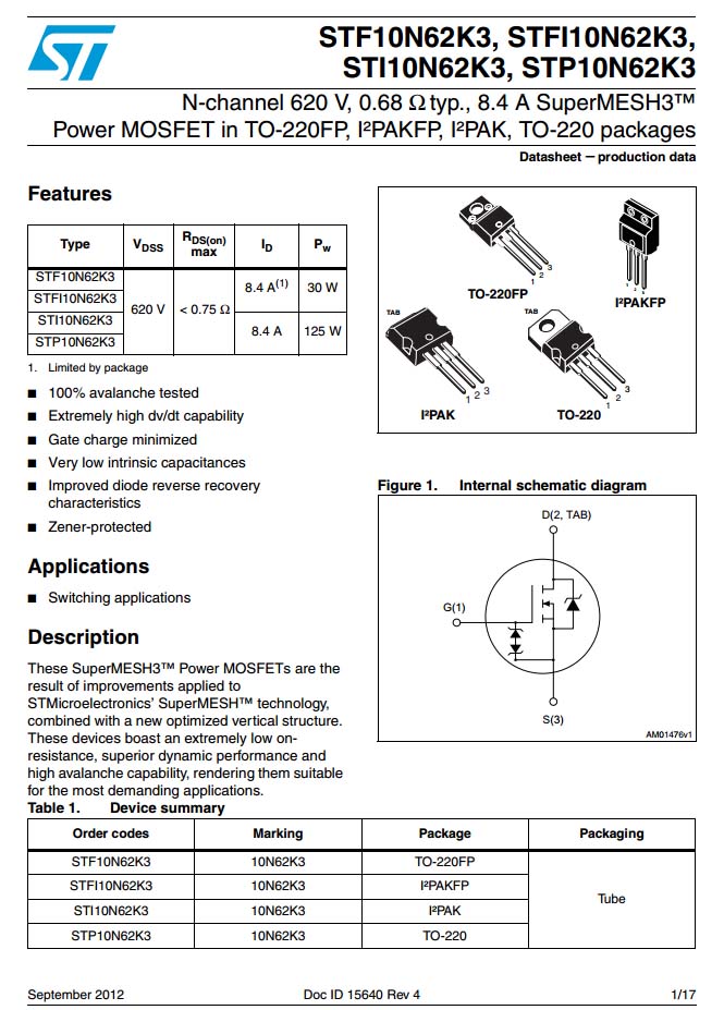 初级开关MOS管采用意法半导体STF10N62K3,耐压620V,导阻小于0.75Ω,TO-220FP封装。