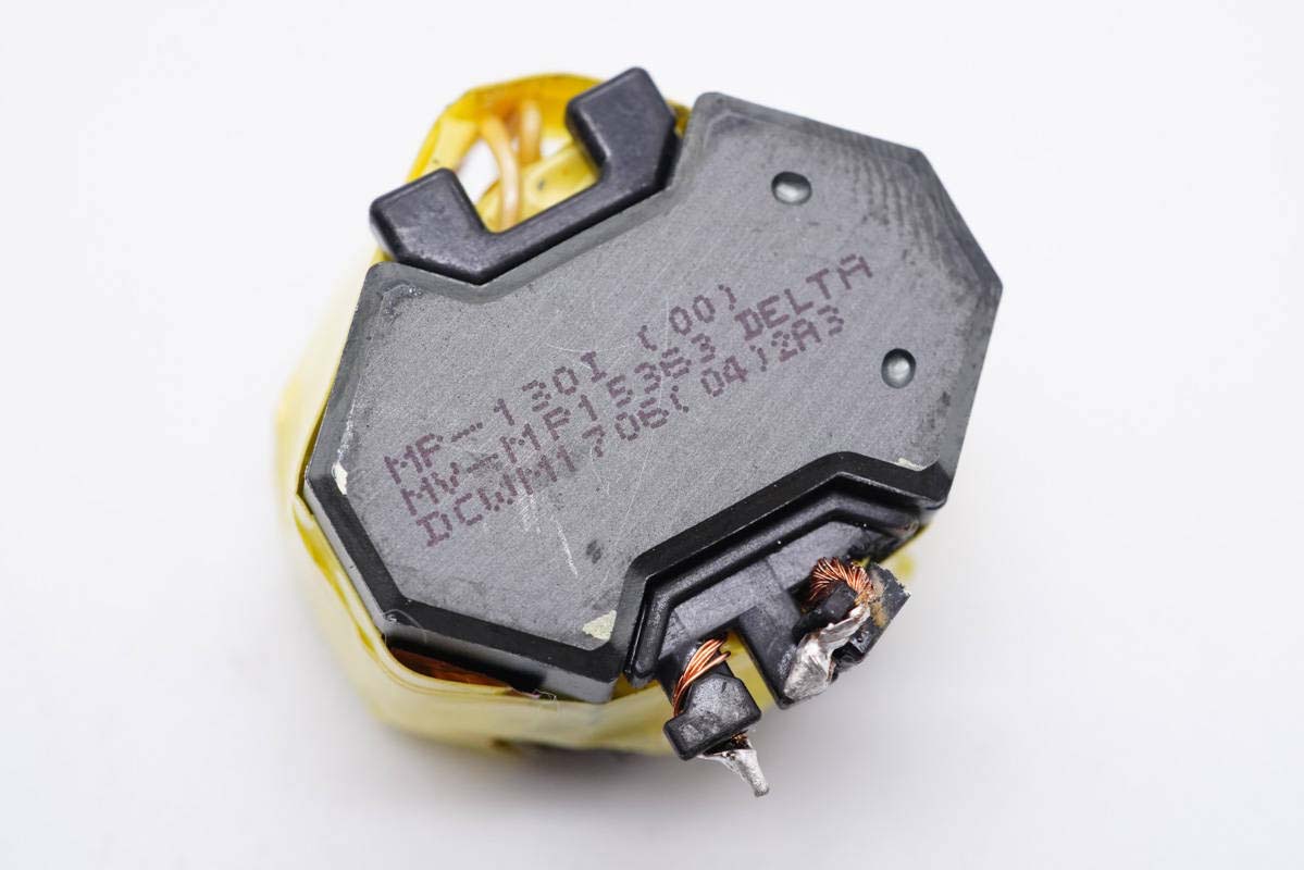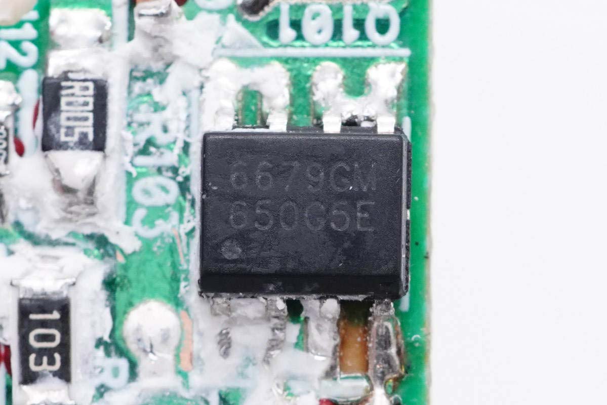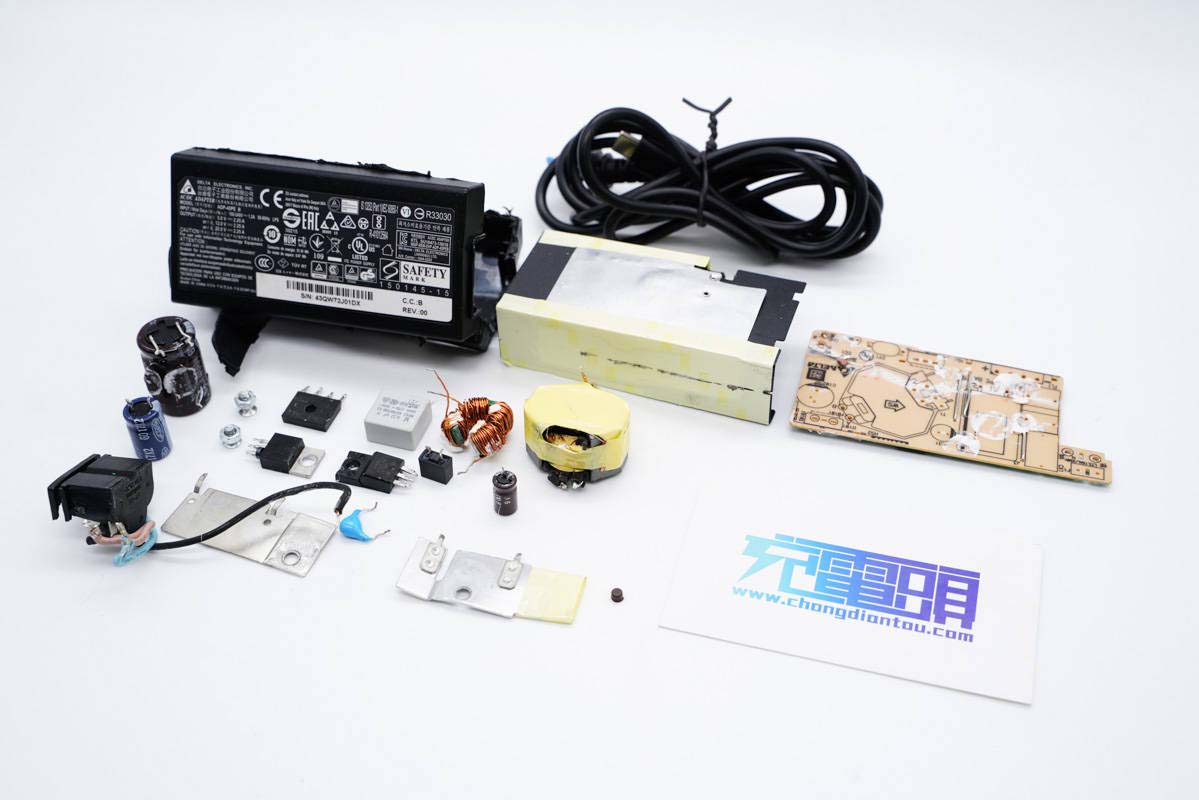 充电头网通过拆解了解到,充电器内部配有大面积散热片为整体进行散热,同时也为高压MOS管和次级整流肖特基发热器件还配有专门的散热片。由于输出电流不大,使用肖特基二极管整流,协议芯片是台达定制型号。采用尼吉康和辉城电解电容进行输入输出滤波,整体用料扎实。