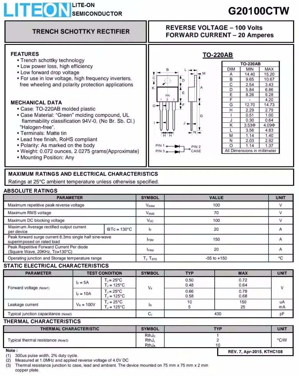 肖特基整流管采用敦南G20100CTW,耐压100V。