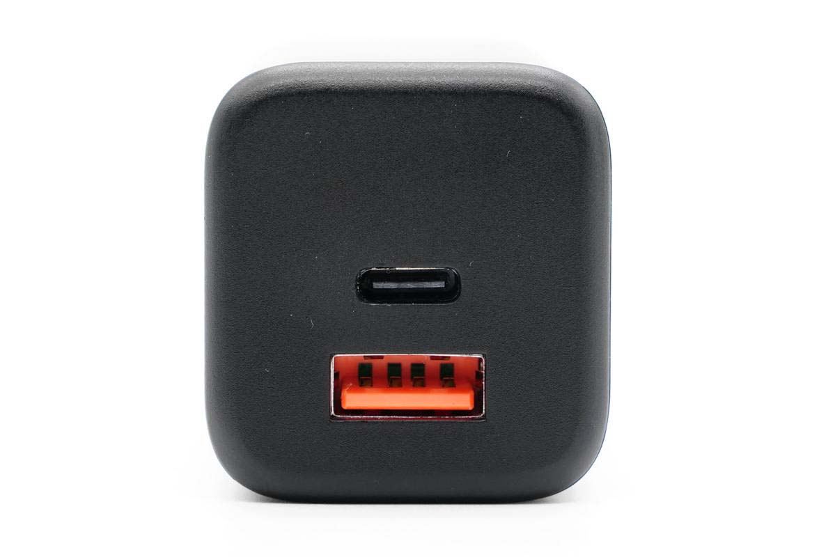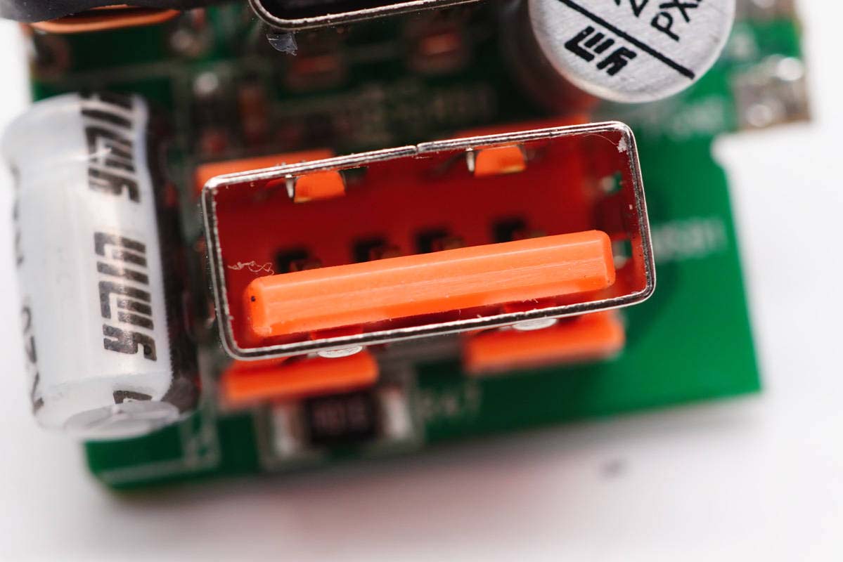 机身顶面也是哑光处理,边缘圆润,配有1A1C双输出接口,分别采用橘红色和黑色胶芯。