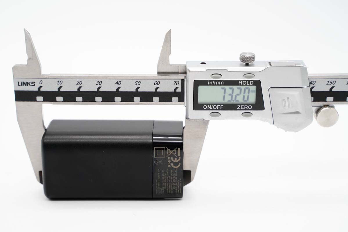 使用游标卡尺实测充电器机身长度为73.2mm。