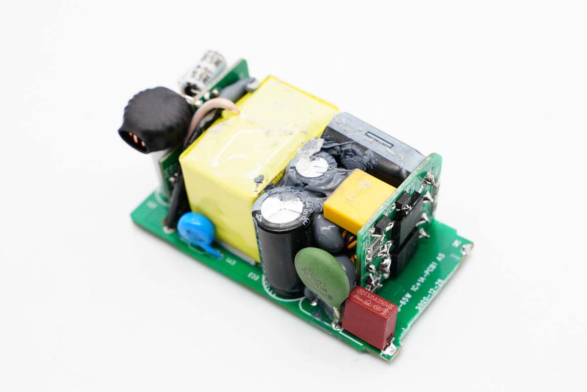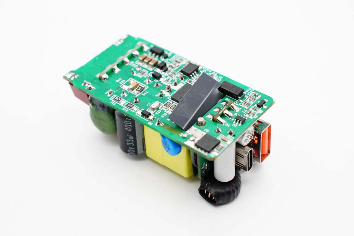 通过对充电器观察发现,鹏元晟这款65W 1A1C氮化镓充电器采用开关电源宽范围输出,USB-C口直接由协议芯片控制输出电压,USB-A口进行二次升降压转换电压输出。下面我们从输入端开始深入了解整个电路设计情况。
