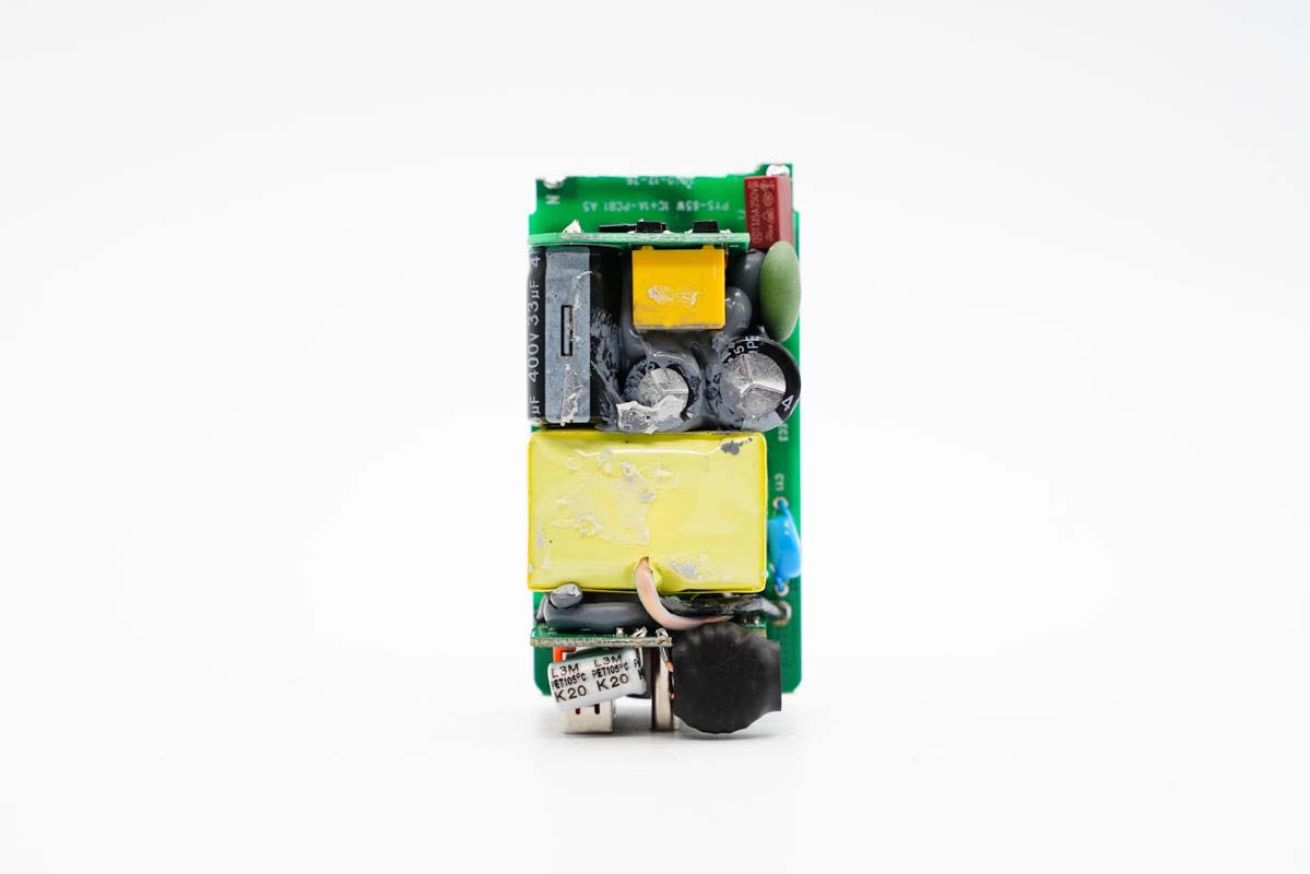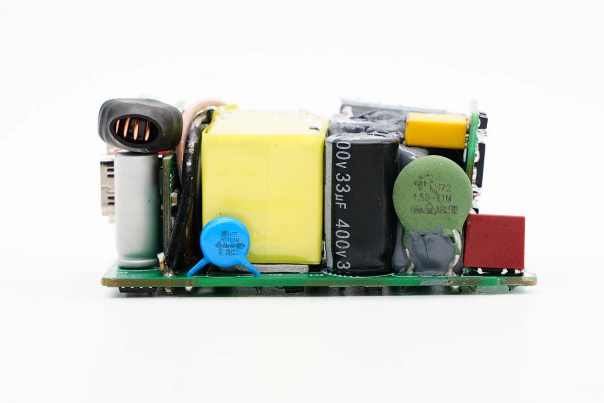 主板侧面一览,主板上还有两颗高压滤波电解电容,中间是变压器和Y电容,变压器下垫有导热垫。