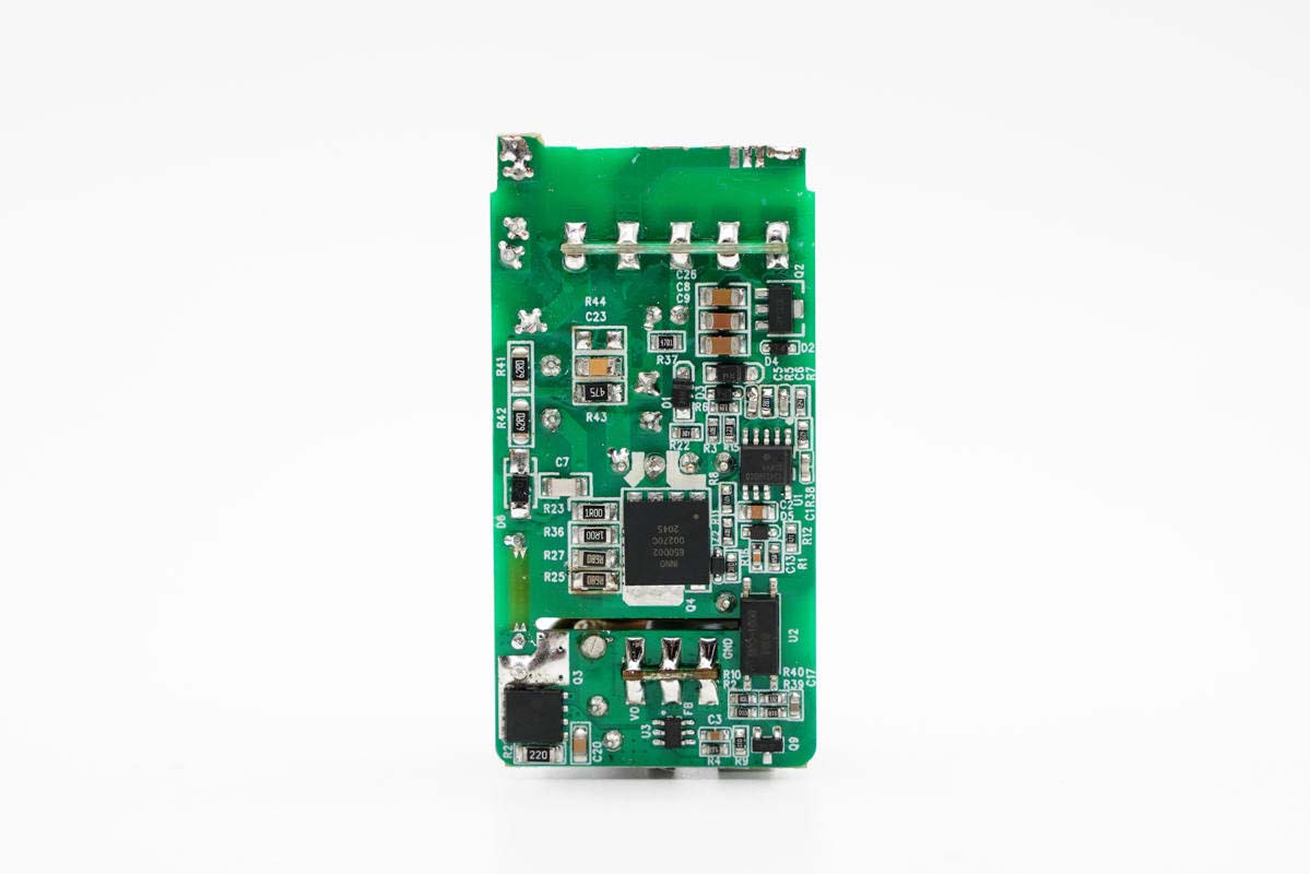 充电头网通过拆解了解到,整个PCBA模块显得相当简洁,元器件布局整齐紧凑,输入输出端均设计有小板,以充分利用内部空间。其中开关电源由安森美NCP1342搭配英诺赛科氮化镓功率芯片,以及MPS MP6908A搭配万代同步整流管组成。由英集芯IP2723T和IP6525S分别控制C口和A口输出电压。采用艾华、永铭电容进行输入输出滤波,整体用料可靠。