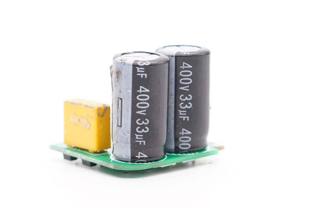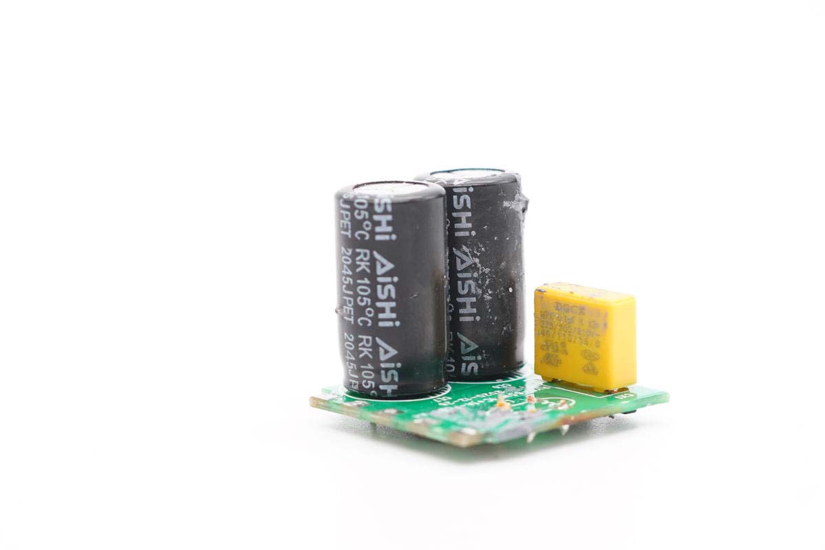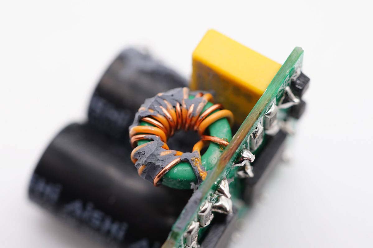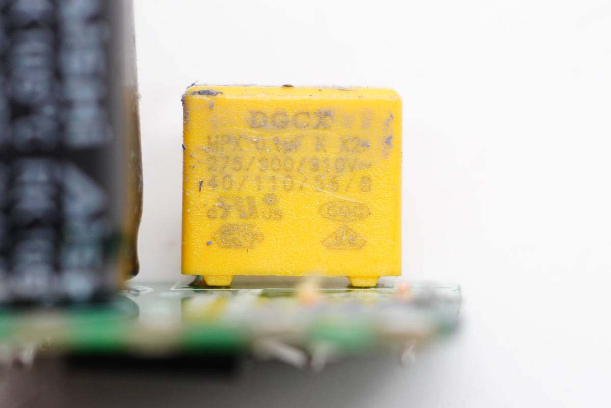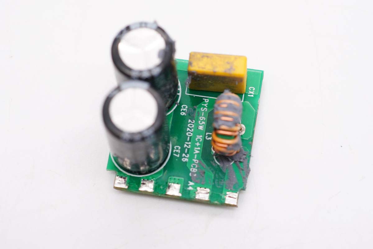 将小板拆下,正面设有共模电感、X电容以及两颗高压滤波电解电容。
