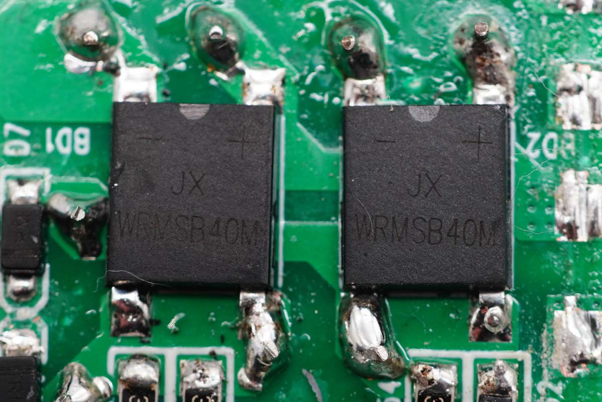主板左侧设有延时保险丝和NTC浪涌抑制电阻,输入端小板上设有两颗两颗整流桥用以均摊发热。