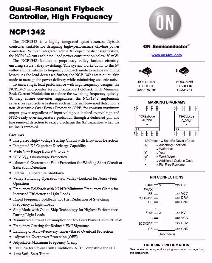 开关电源主控芯片采用ON安森美NCP1342,这是一颗高频准谐振反激初级PWM控制器,内置主动X2电容放电和多重完善的保护功能,具有超低的待机功耗。