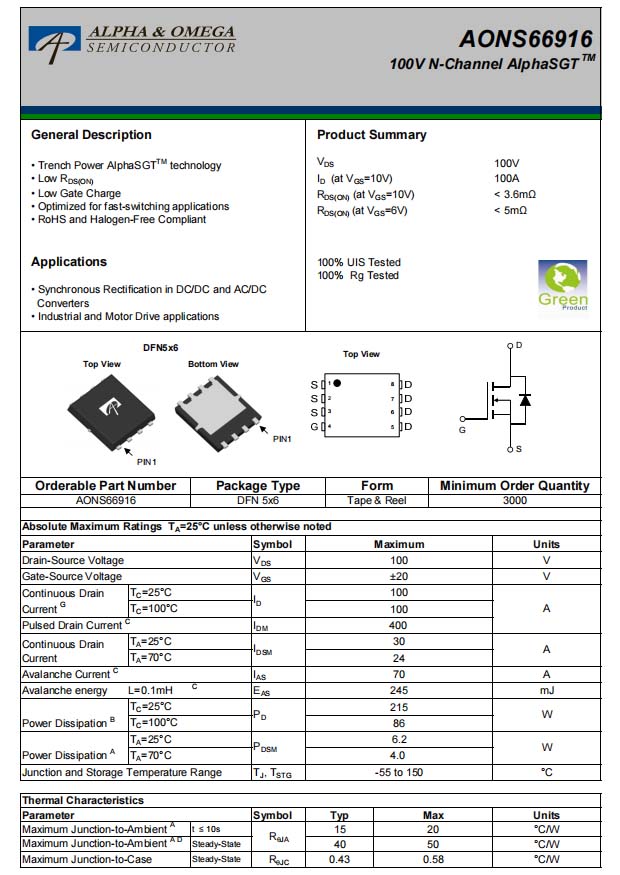 同步整流MOS管采用AOS万代AONS66916,NMOS,耐压100V,DFN5x6封装。