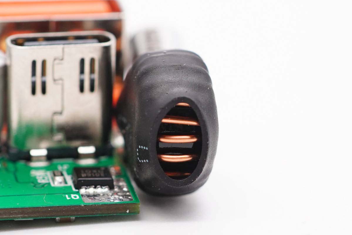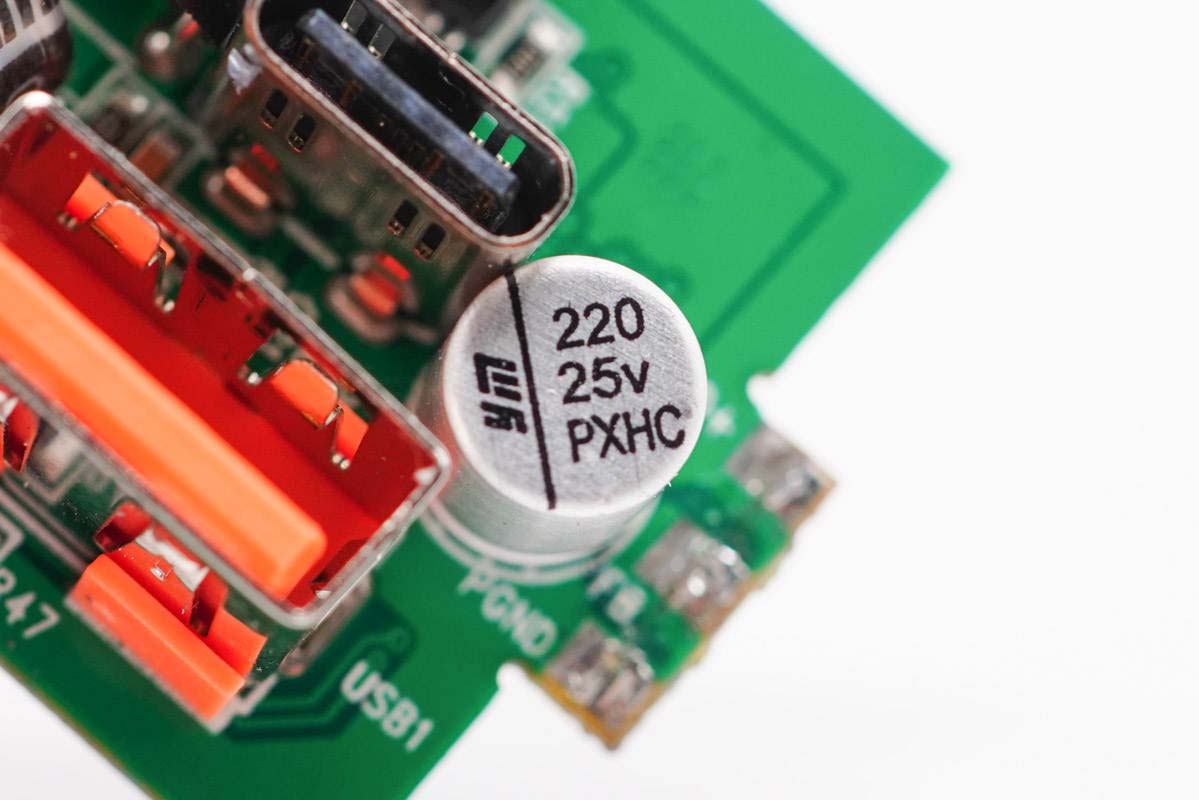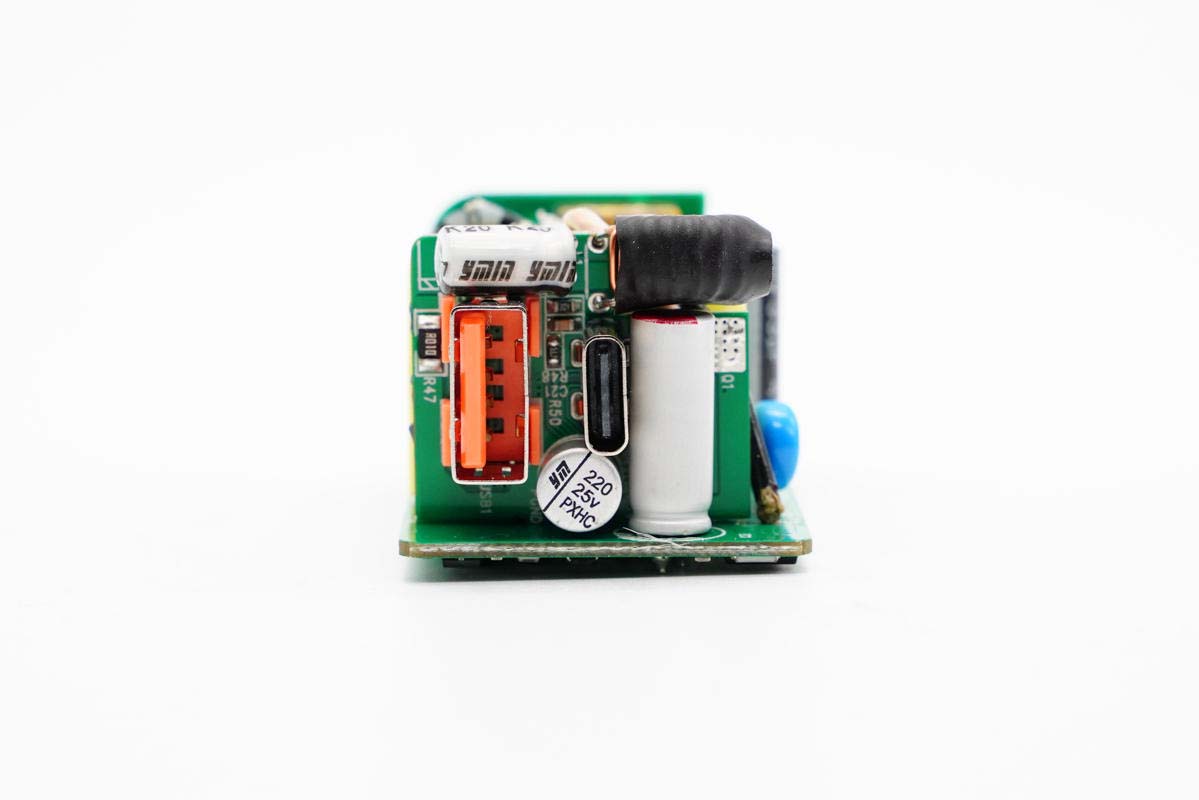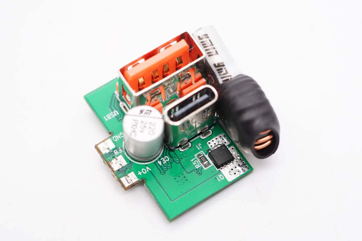 将小板拆下,正面设有两颗滤波电容、降压电感和输出VBUS开关管,两个USB母座直接垂直焊接在小板上。
