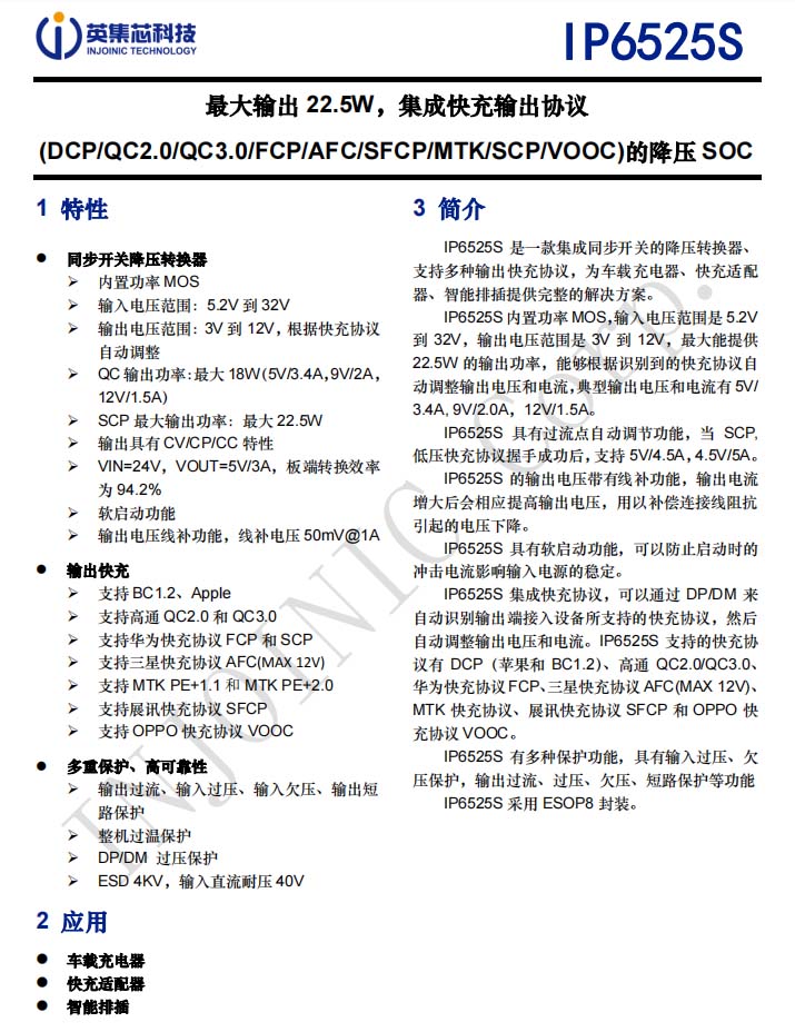 IP6525S具有过流点自动调节功能;具有软启动功能,可以防止启动时的冲击电流影响输入电源的稳定;有多种保护功能,具有输入过压、欠压保护,输出过流、过压、欠压、短路保护等功能,采用ESOP8封装。