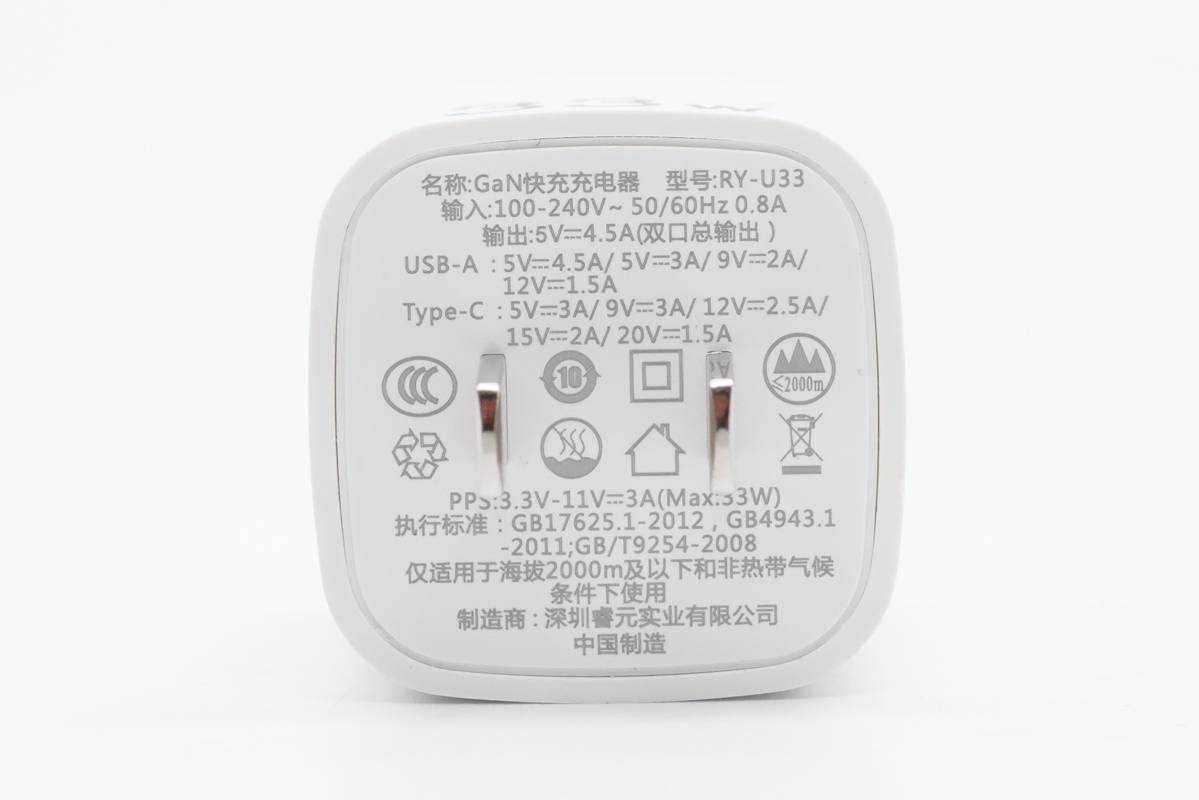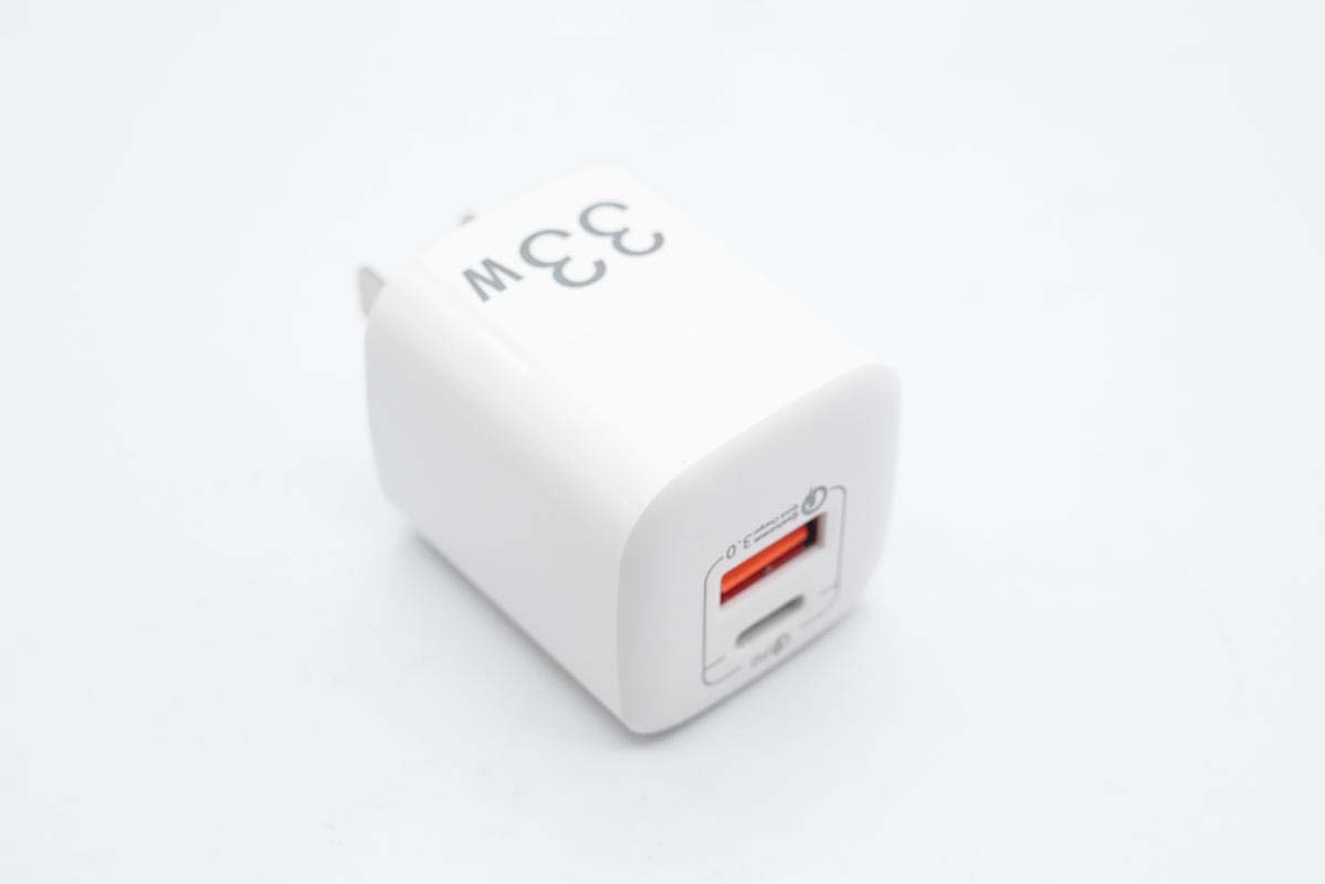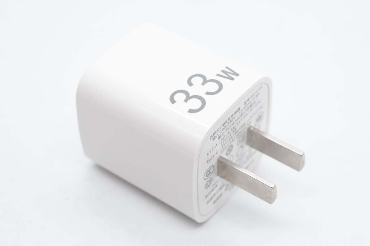 这款快充采用固定式国标插脚,腰身一面印有33W字样,表明输出功率。