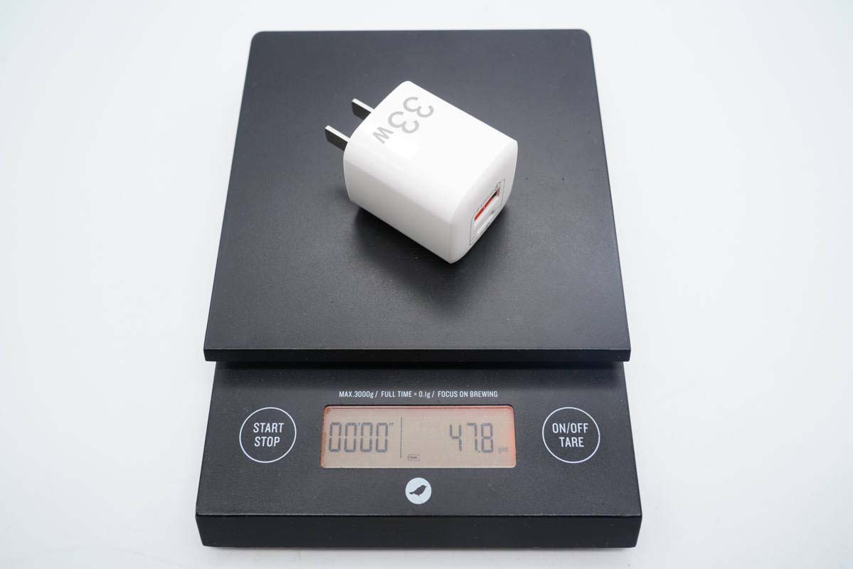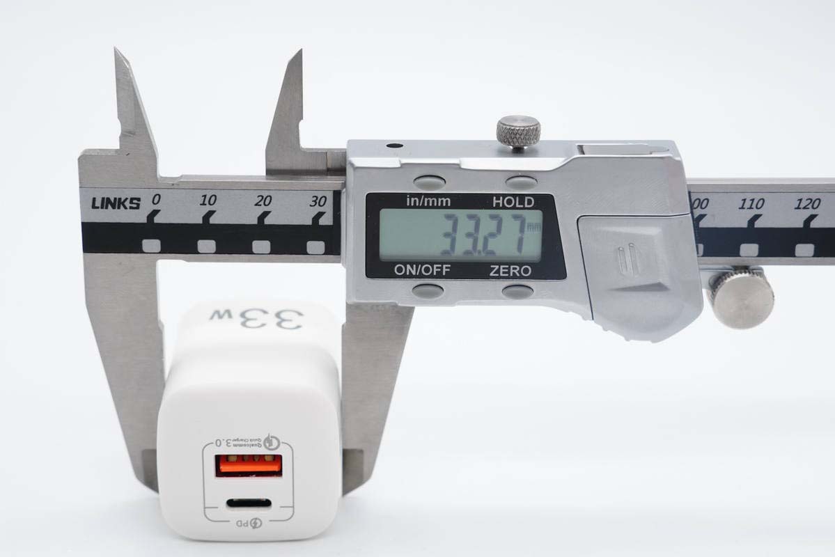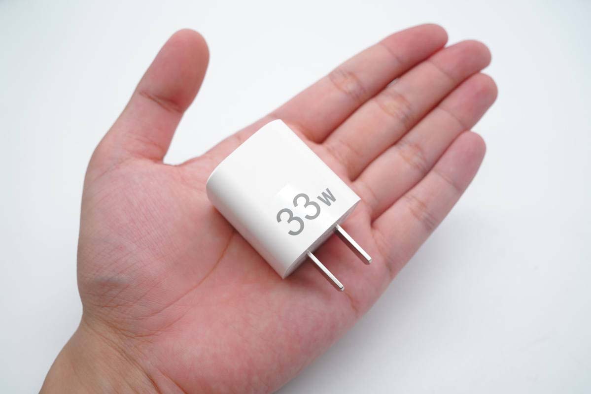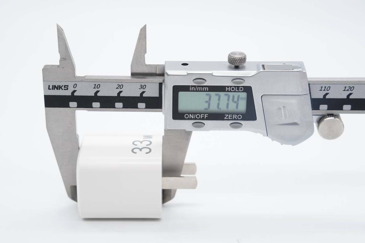 这款快充采用固定式国标插脚,腰身一面印有33W字样,表明输出功率。