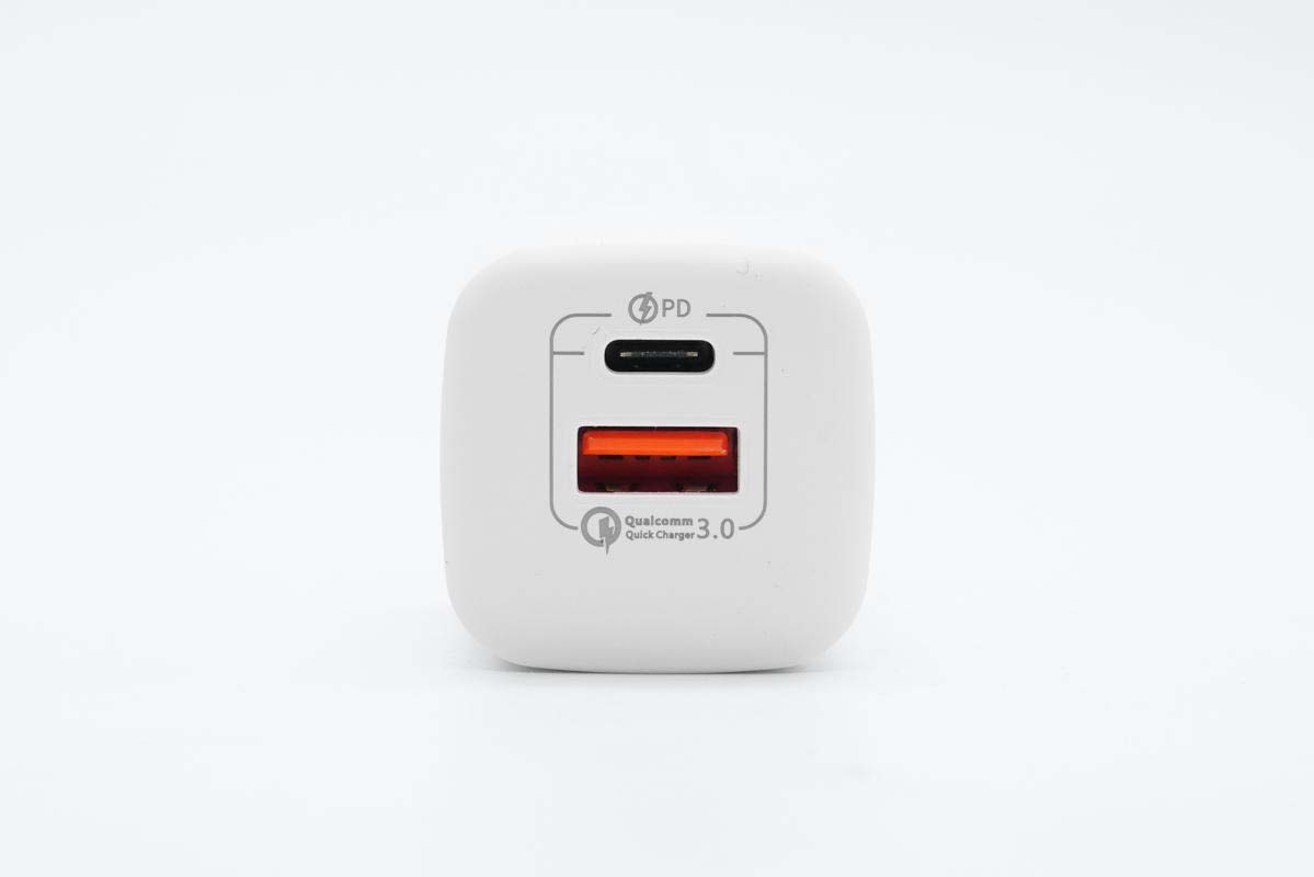 充电器采用PC材质白色外壳,腰身是亮面和哑光撞色设计,各面间过渡圆润使用手感好。