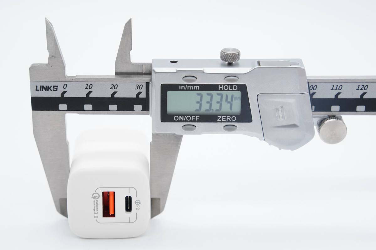 使用游标卡尺实测充电器机身高度为37.74mm。