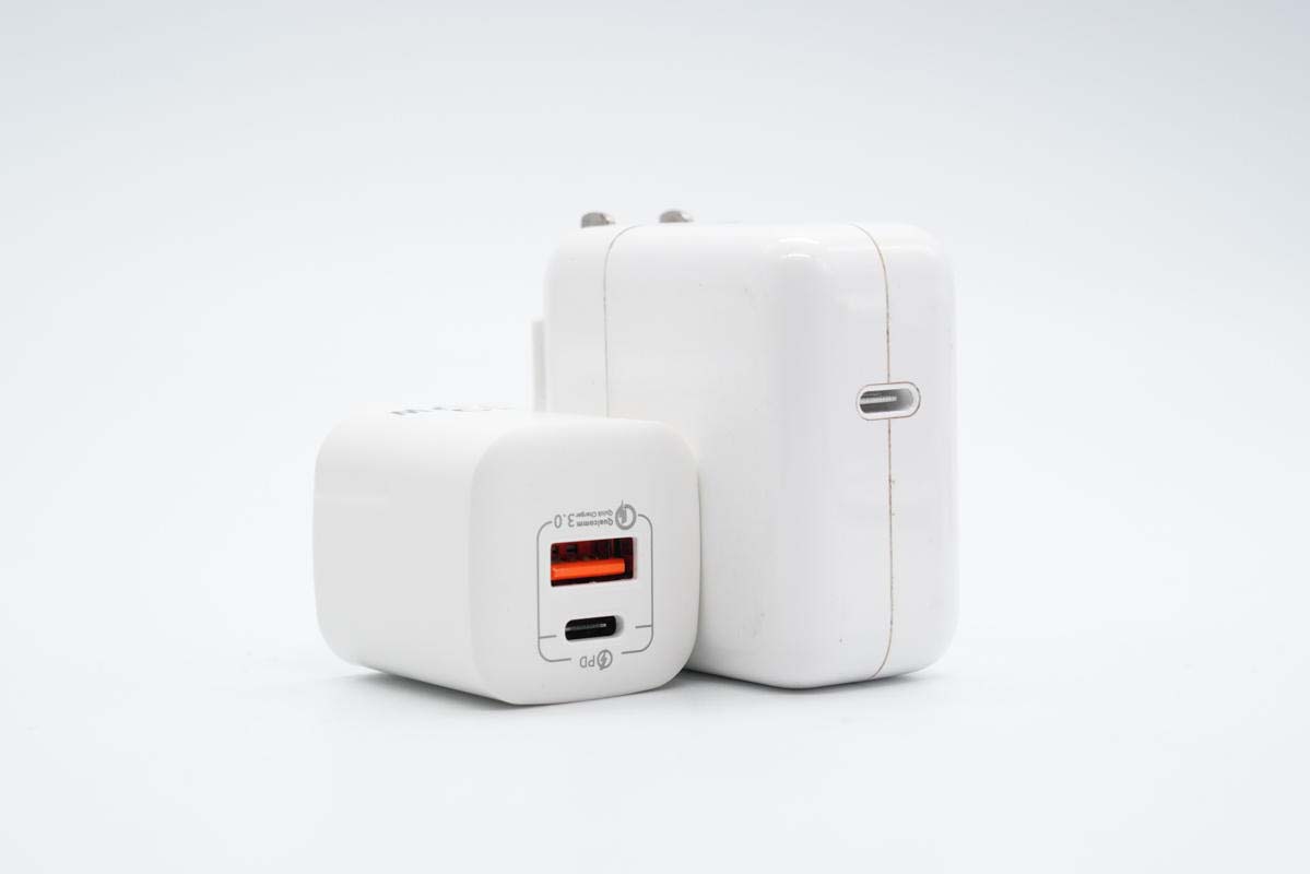 和苹果30W充电器直观对比,接口更多,体积优势也非常明显。